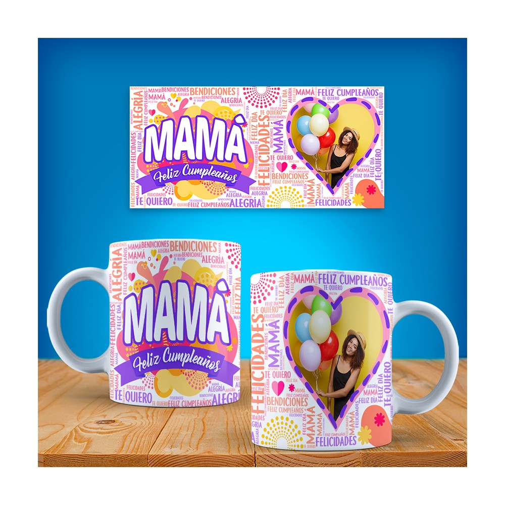 La taza presenta el mensaje "Mamá feliz cumpleaños" en letras llamativas y encantadoras, ubicada sobre un fondo decorado con diferentes palabras y frases como "alegría", "sorpresa", "bonito día" y "feliz día". Cada palabra representa un sentimiento o deseo que tienes para tu madre en su día especial.