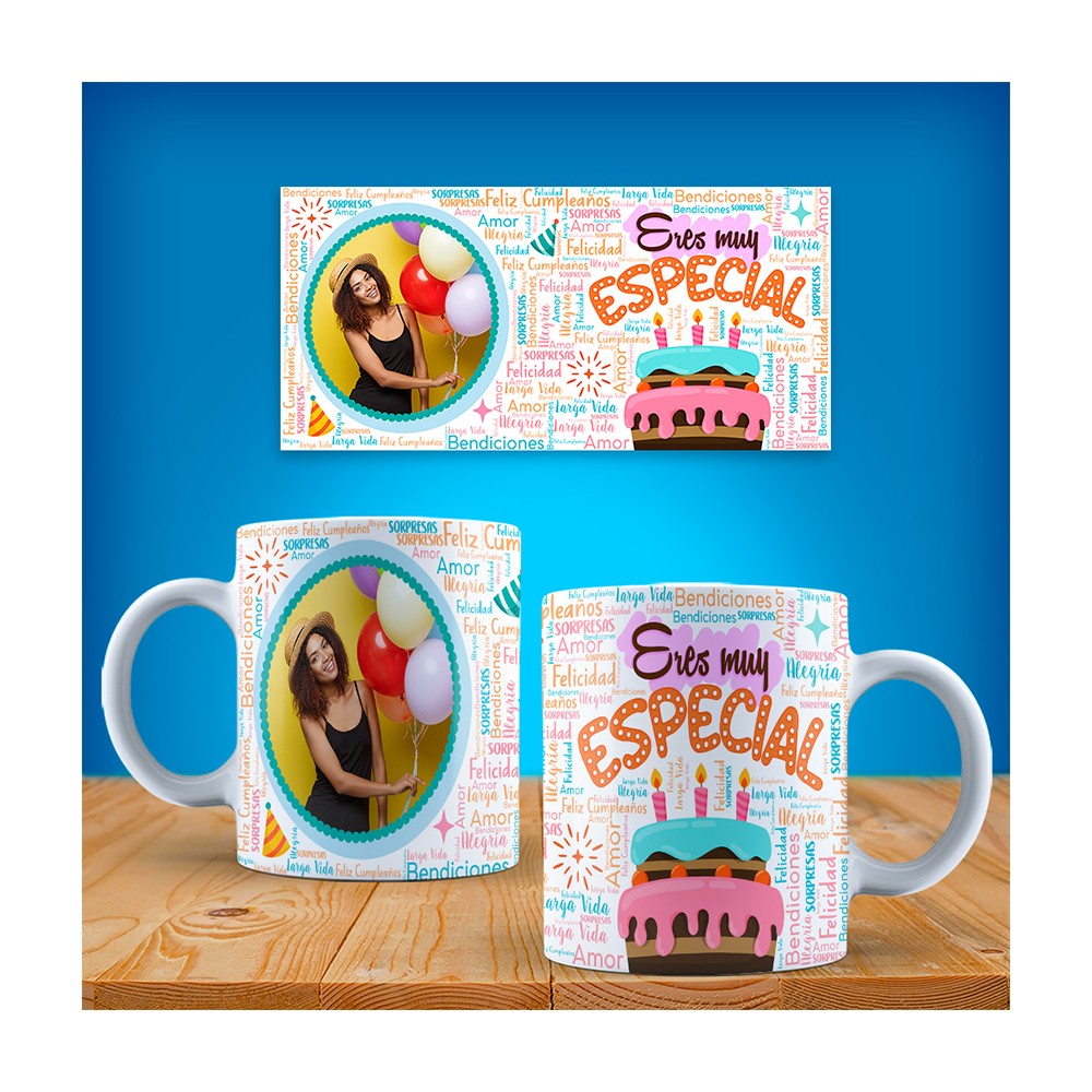La taza para cumpleaños está decorada con una composición de palabras y frases llenas de positividad y alegría, como "alegría", "Felicidad", "Sorpresas", "Bendiciones", "Larga vida" y "Amor" entre otras. Además, cuenta con una bonita ilustración de una tarta de pisos con velas que añade un toque festivo a la taza de cumpleaños debajo de la frase "Eres muy especial", mensaje que muestra tu aprecio y amor.