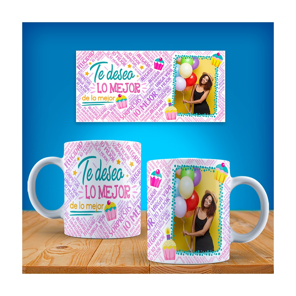 La taza para cumpleaños está decorada con una composición de palabras y frases llenas de positividad y alegría, como "alegría", "Felicidad", "Sorpresas", "Larga vida" y "lo mejor" entre otras. Además, cuenta con ilustraciones de Cupcakes que añaden un toque dulce y festivo a la taza y la frase "Te deseo lo mejor de lo mejor", mensaje que muestra tu aprecio y amor.