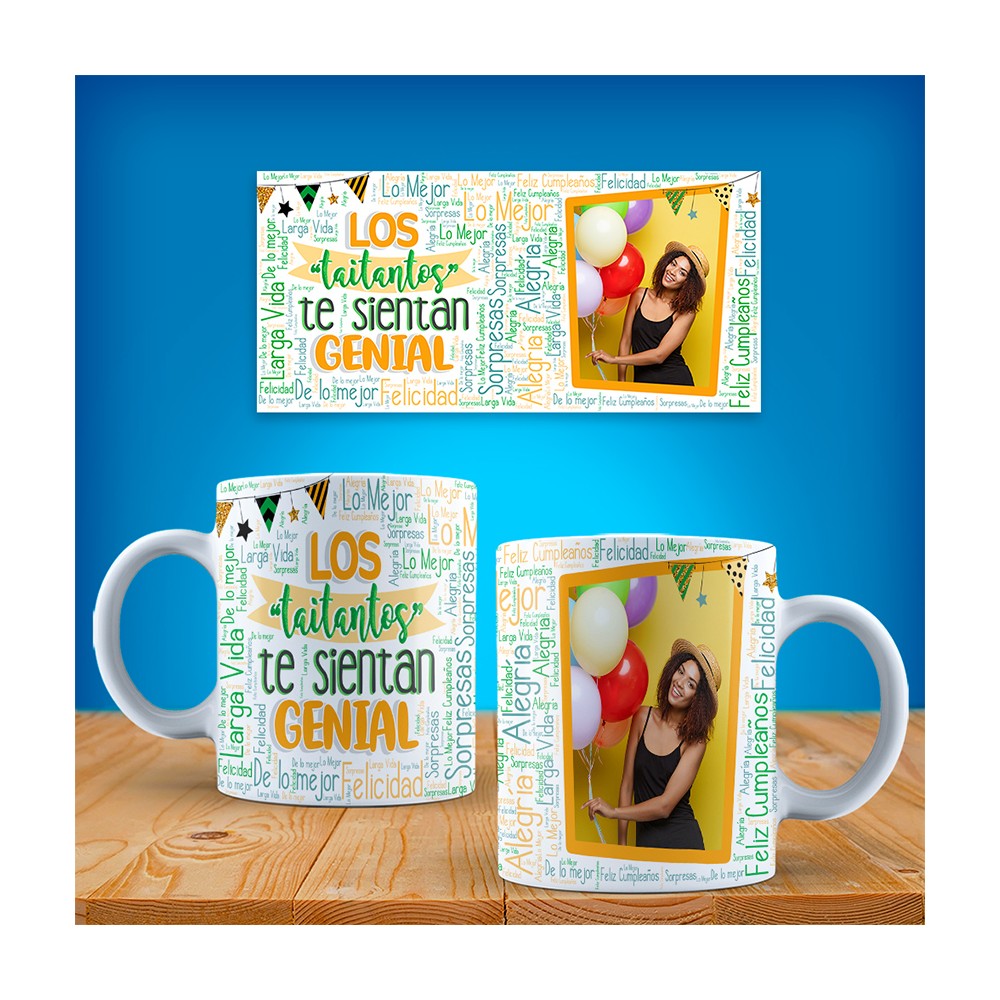 La taza para cumpleaños está decorada con una composición de palabras y frases llenas de positividad y alegría, como "alegría", "Felicidad", "Sorpresas", "Larga vida" y "lo mejor" entre otras. Además, cuenta con una ilustración de banderines que añade un toque festivo a la taza y la frase "Los taitantos te sientan genial", mensaje que seguro que apreciara y sacara una sonrisa a la cumpleañera.