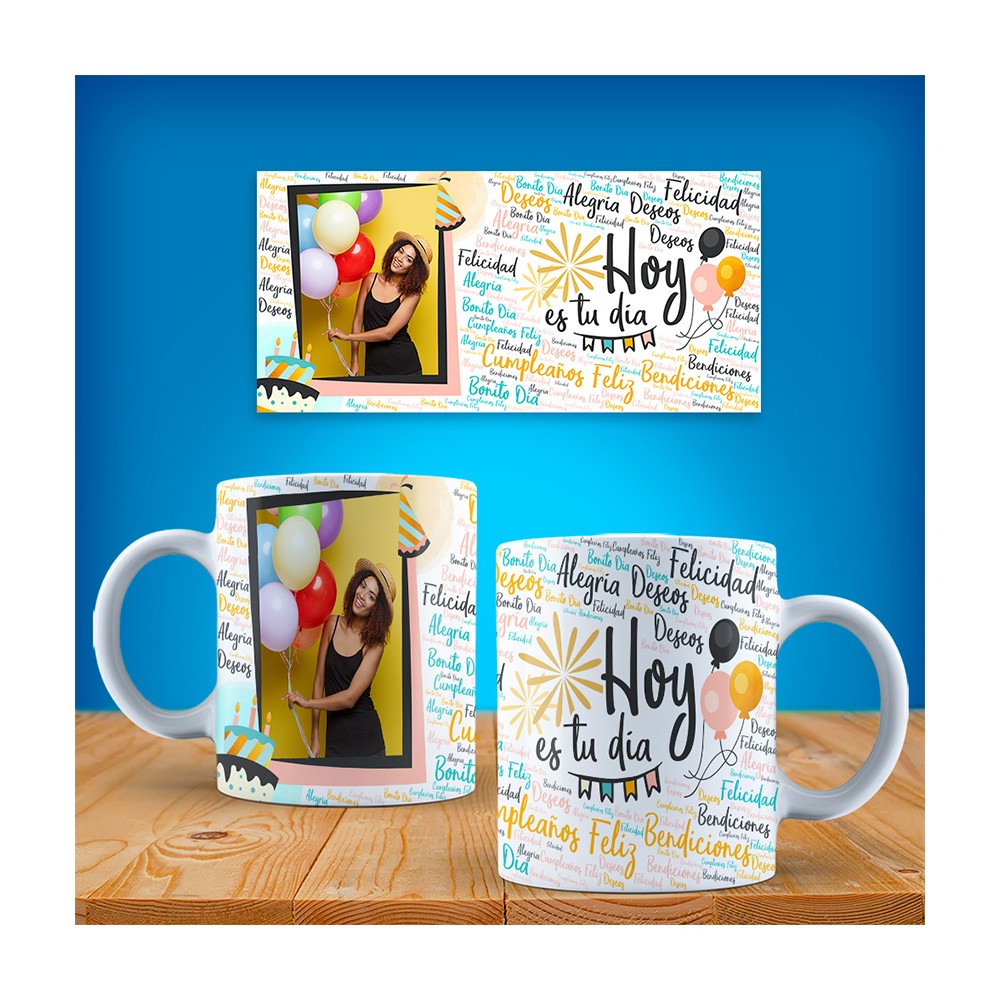La taza para cumpleaños está decorada con una composición de palabras y frases llenas de positividad y alegría, como "alegría", "Deseos", "Felicidad" "Bendiciones"y "bonito día" entre otras. Además, cuenta con ilustraciones de globos, banderines, tarta de cumpleaños y gorro que añaden un toque festivo y emocionante. En el centro, la frase "Hoy es tu día" se destaca, celebrando ese día especial de una manera única.