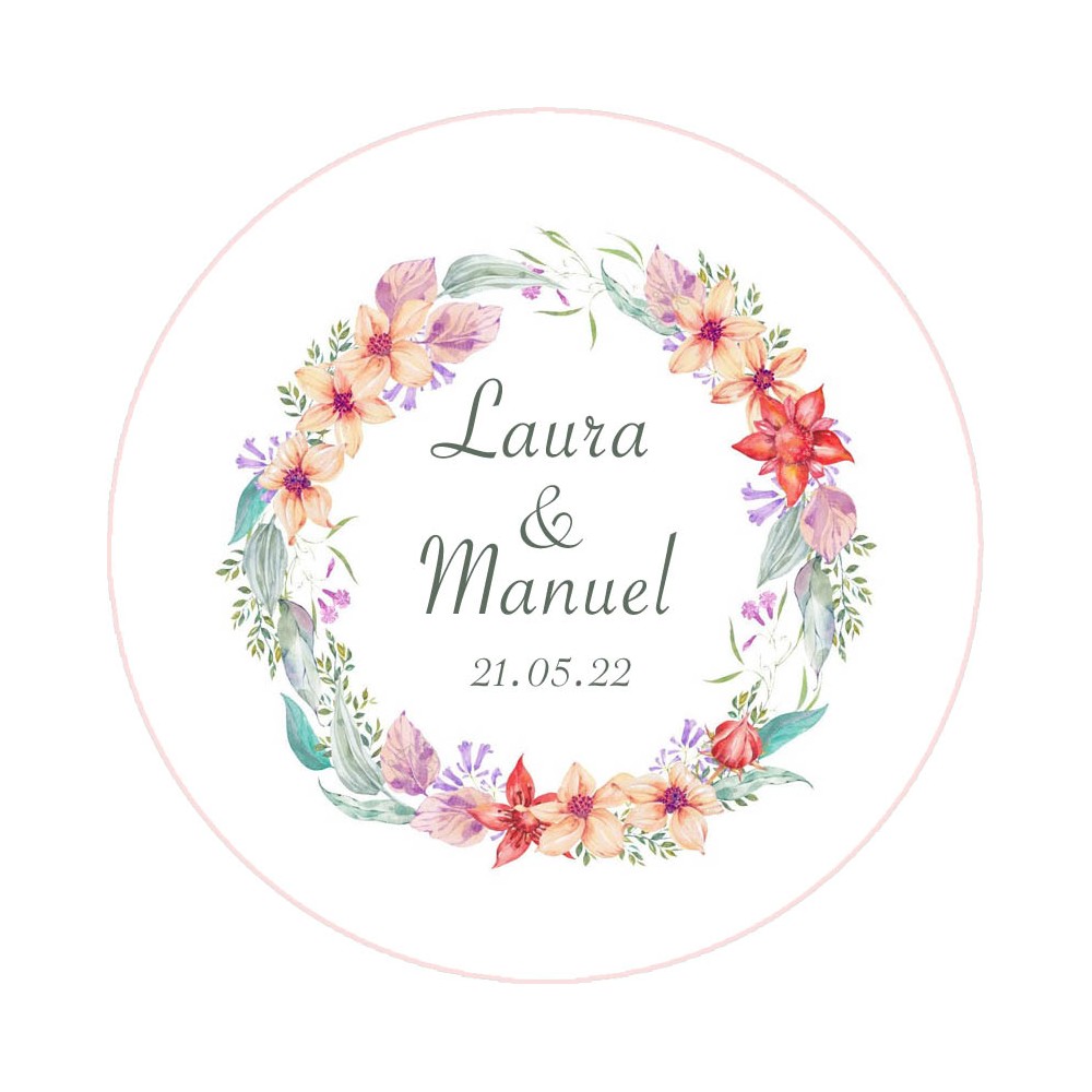Esta chapa con imán tiene un bonito y alegre diseño con una corona floral multicolor, puedes personalizar los nombres y la fecha del enlace para crear un bonito detalle para tu boda, será todo un éxito.