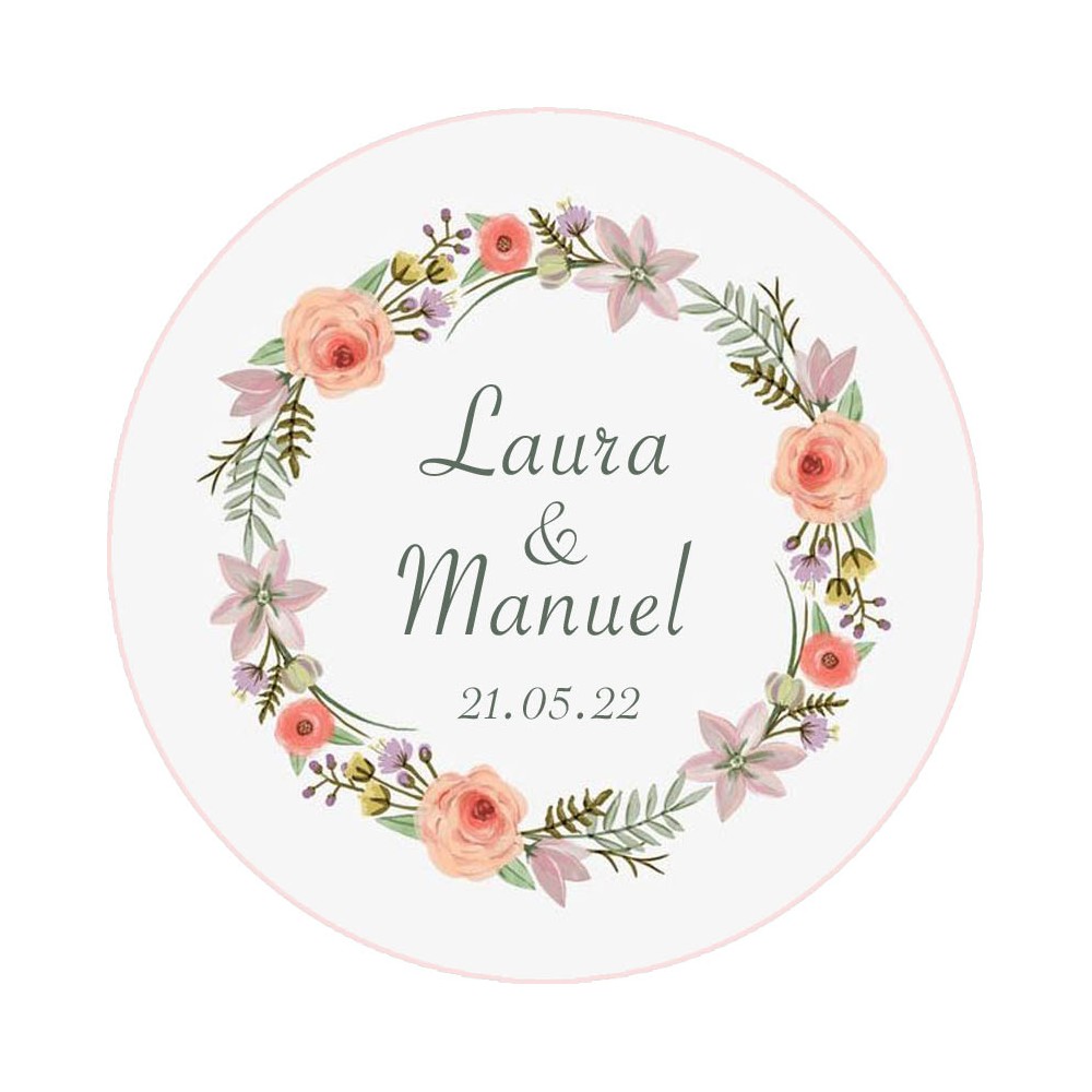 Esta chapa con imán esta decorada con una bonita corona floral, puedes personalizar los nombres y la fecha del enlace para crear un bonito detalle para tu boda, será todo un éxito.