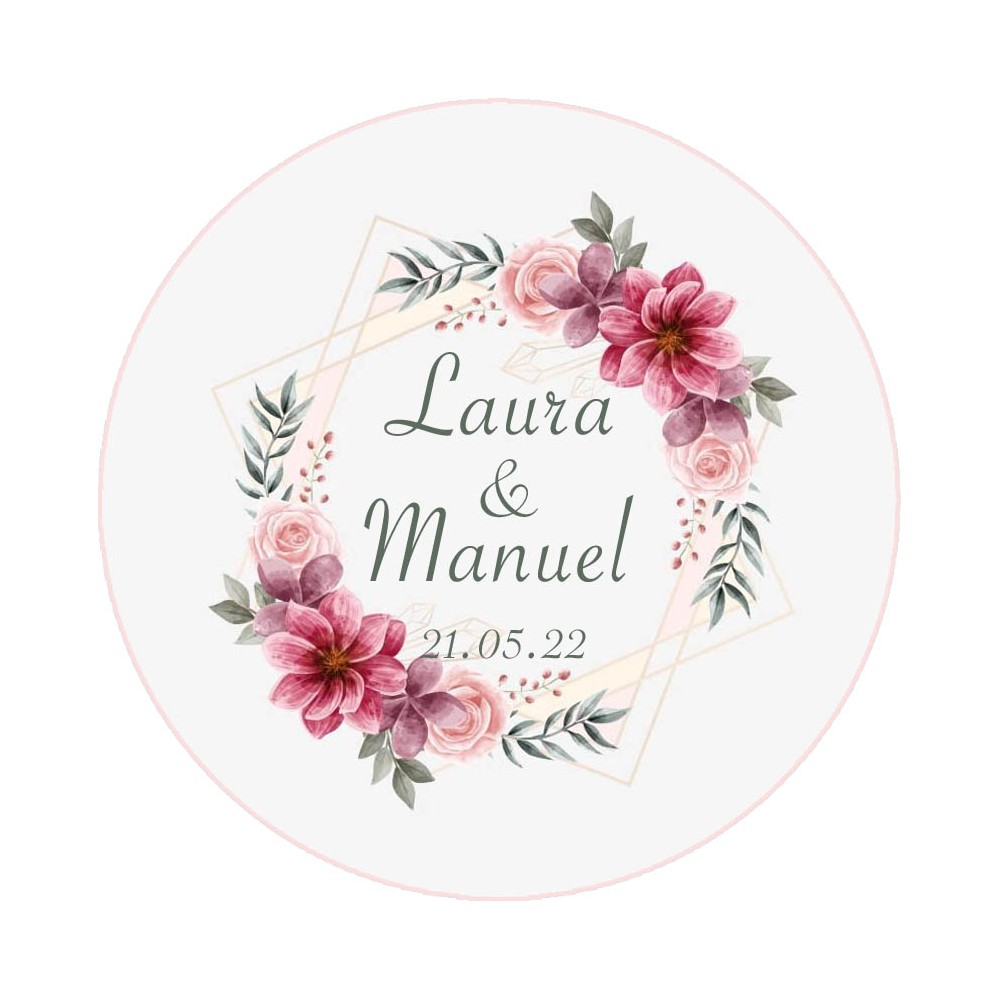 Esta chapa con imán esta decorada con un bonito y sofisticado diseño geométrico adornado con flores en color rosa, malva y burdeos, puedes personalizar los nombres y la fecha del enlace para crear un bonito detalle para tu boda, será todo un éxito.