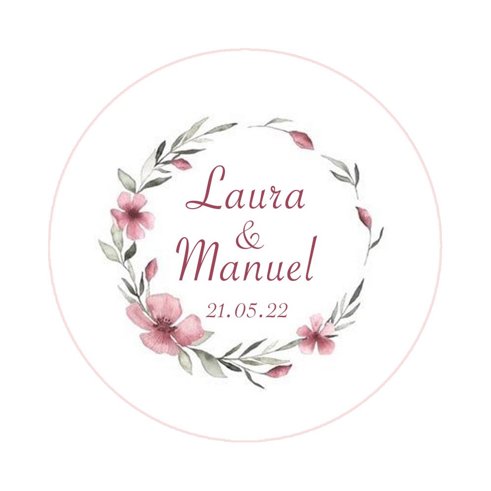 Esta chapa con imán con un sofisticado diseño esta decorada con una bonita corona de flores y hojas en color burdeos y verde, puedes personalizar los nombres y la fecha del enlace para crear un bonito detalle para tu boda, será todo un éxito.