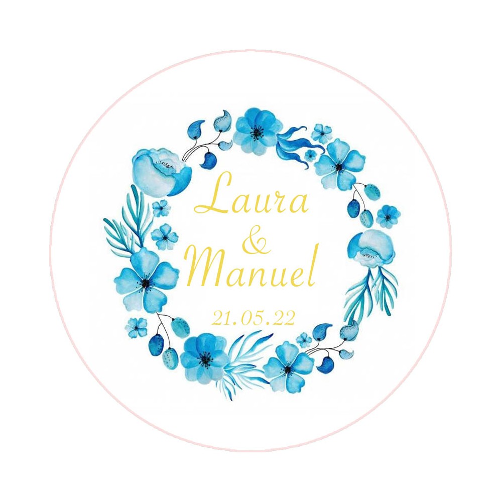 Esta chapa con imán esta decorada con una bonita y alegre corona floral en color azul, puedes personalizar los nombres y la fecha del enlace para crear un bonito detalle para tu boda, será todo un éxito.