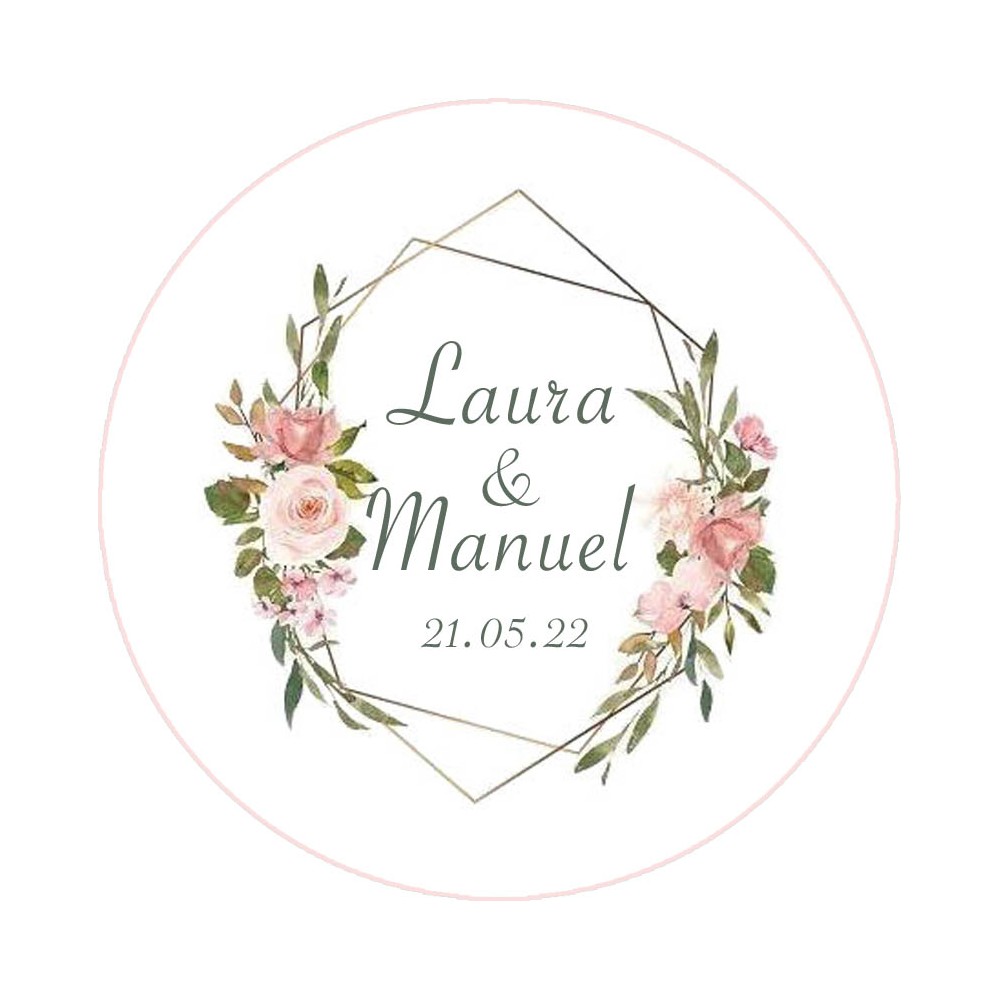 Esta chapa con imán tiene sofisticado diseño geométrico decorado con rosas de color rosa y hojas verdes, puedes personalizar los nombres y la fecha del enlace para crear un bonito detalle para tu boda, será todo un éxito.
