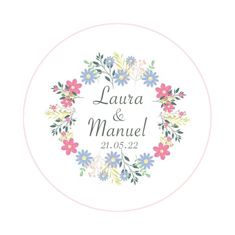 Esta chapa con imán esta decorada con ramilletes de flores y hojas formando una delicada corona de estilo silvestre, puedes personalizar los nombres y la fecha del enlace para crear un bonito detalle para tu boda, será todo un éxito.