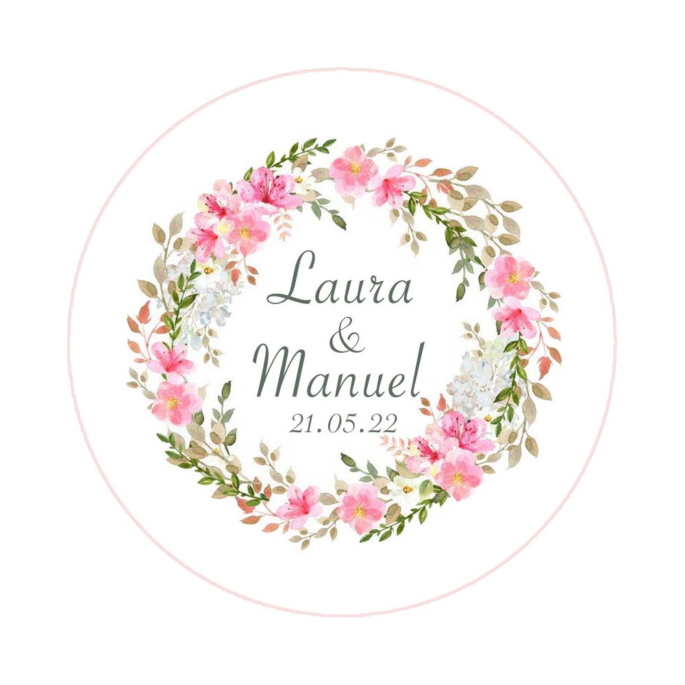 Esta chapa con imán esta decorada con una sofisticada y delicada corona de flores y hojas en color rosa, blanco y verde, puedes personalizar los nombres y la fecha del enlace para crear un bonito detalle para tu boda, será todo un éxito.