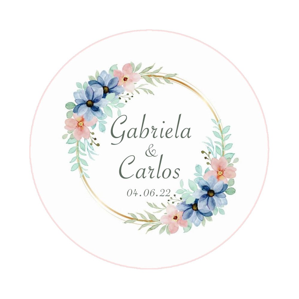 Esta chapa con imán de estilo sofisticado lleva impresa una delicada corona decorada con flores en tonos rosas y azules con hojas verdes, puedes personalizar los nombres y la fecha del enlace para crear un bonito detalle para tu boda, será todo un éxito.