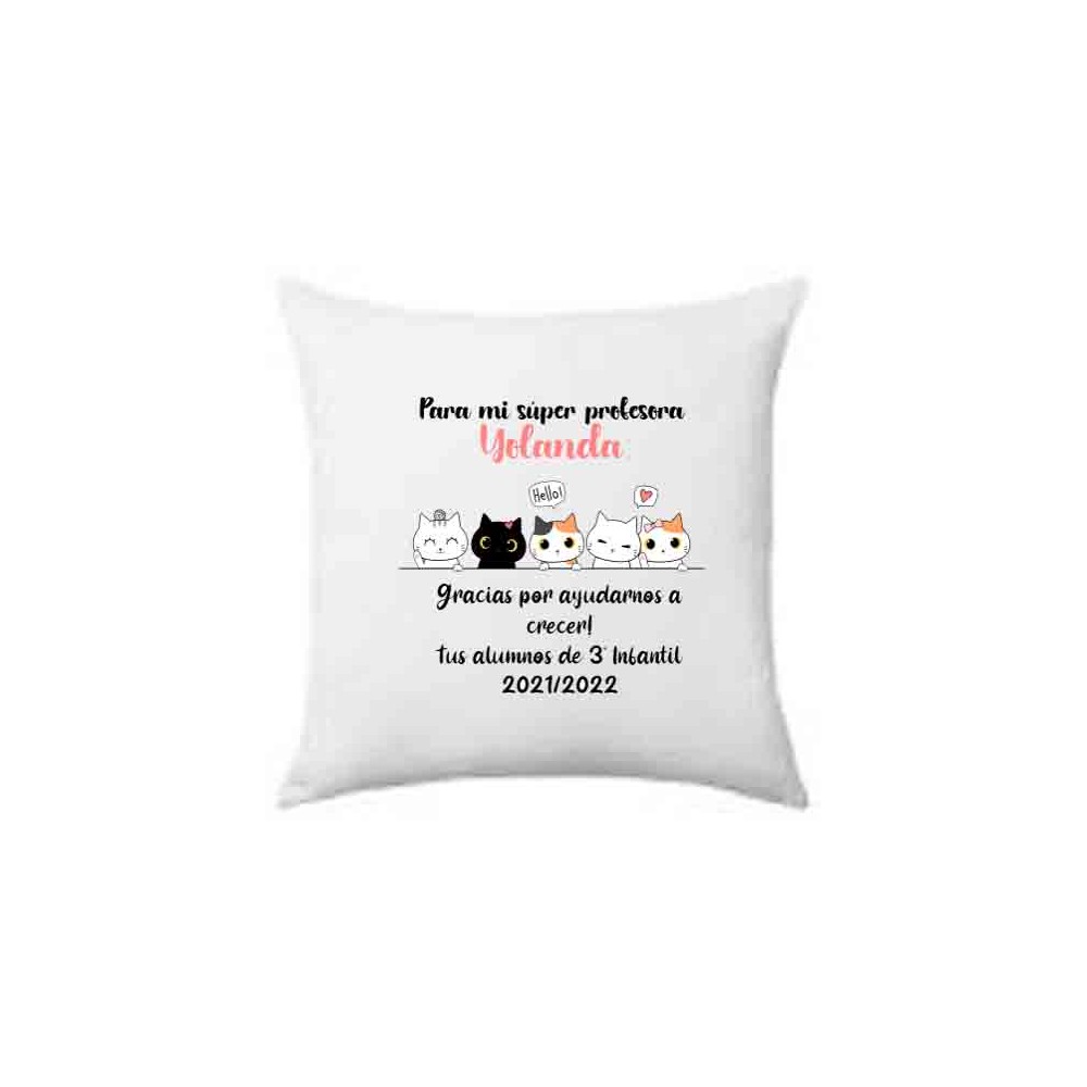 Celebra el fin de curso con gratitud hacia la mejor profe del mundo. Nuestro cojín de 45x45 cm, adornado con un fila de gatitos y la frase "Para mi súper profesora" que puedes personalizar con el nombre de la profesora de tu hij@, es el regalo perfecto para expresar tu agradecimiento.
