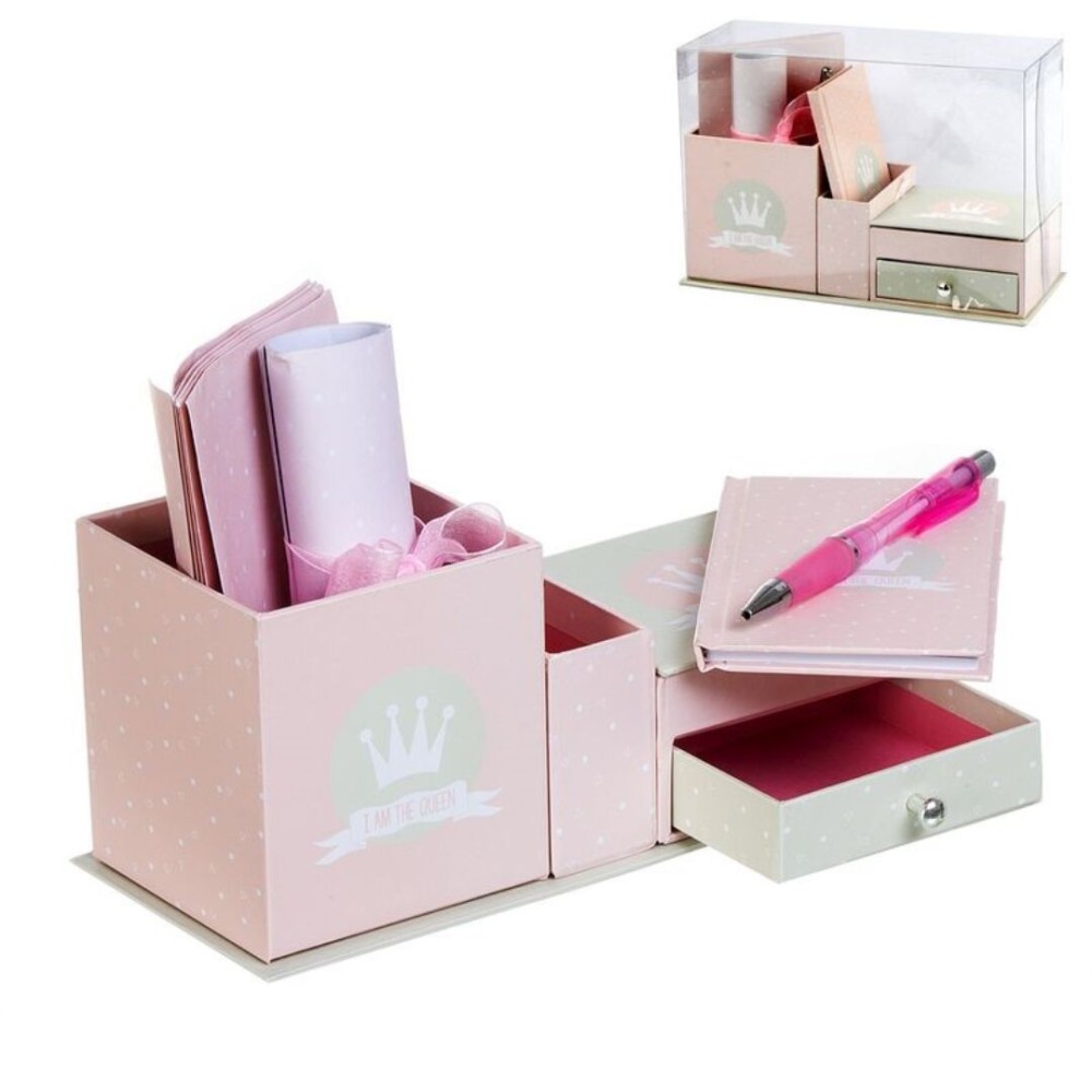 Organizador de escritorio de papel en tonos rosas y beiges.