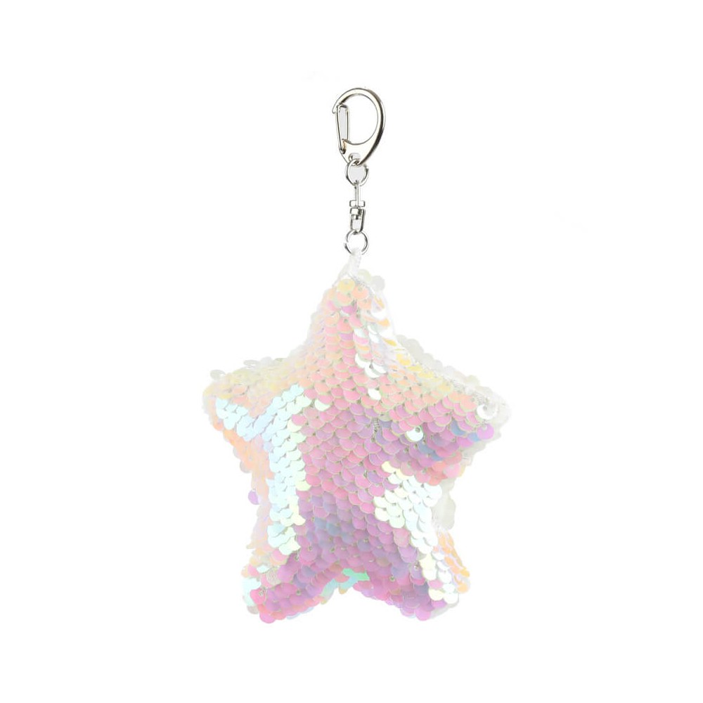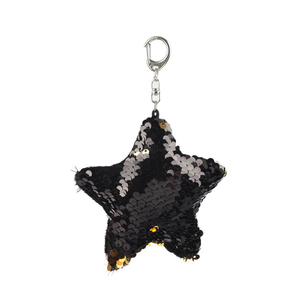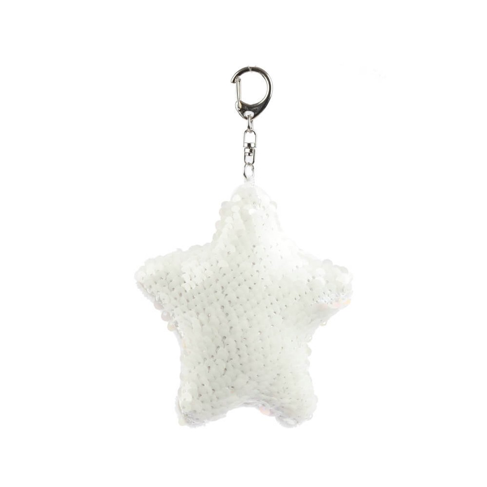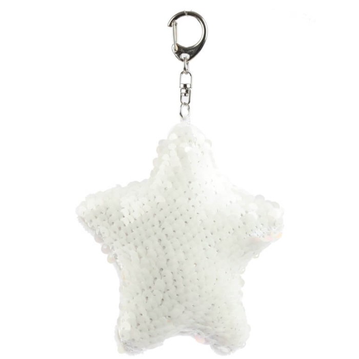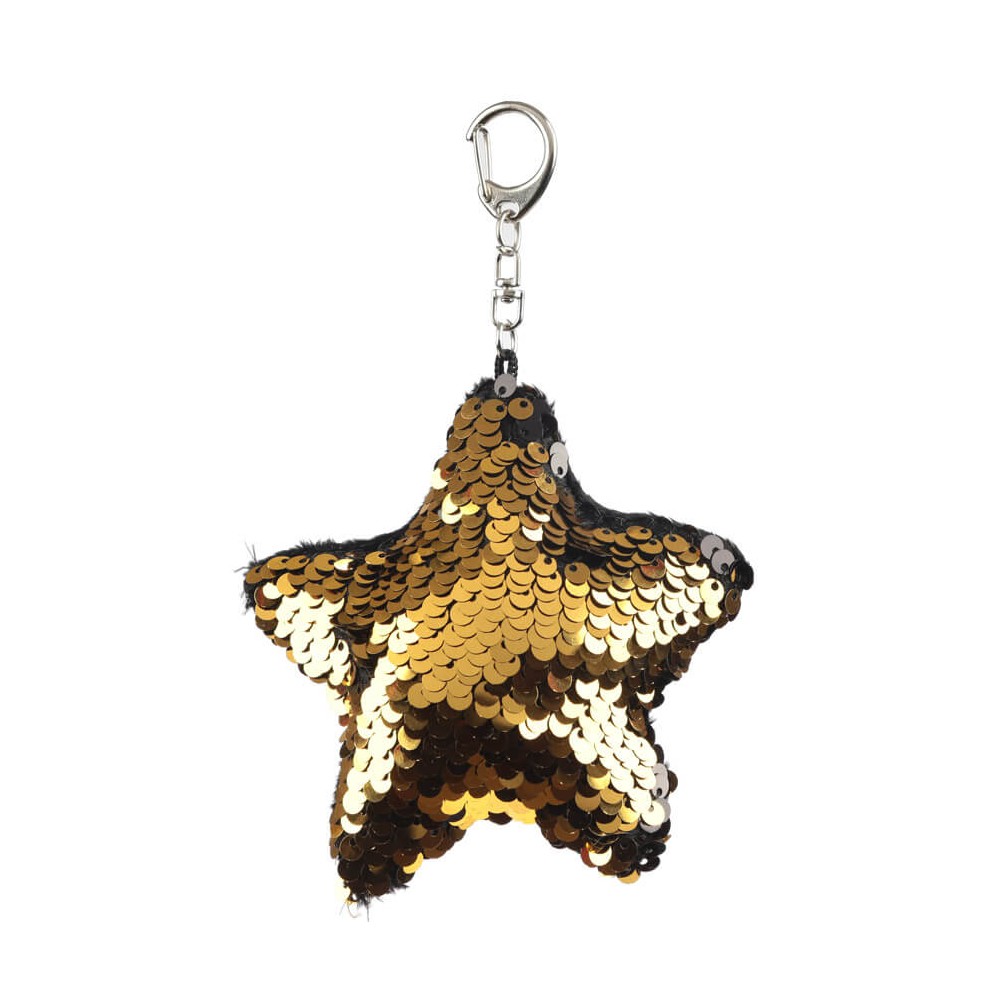 Llavero original con forma de estrella realizado en tela recubierta de lentejuelas de plástico con cadena de metal y cierre con gancho para colocar las llaves o para colgarlo del bolso, maleta... en forma de decoración.