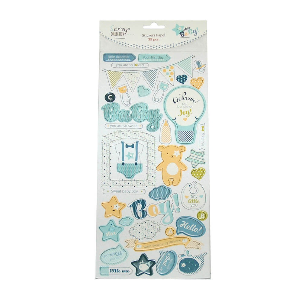 38 piezas adhesivas con motivos infantiles de bebe en color azul y amarillo, perfectas para decorar trabajos de scrapbooking, invitaciones de bautizo, álbumes de fotos, cuadros de bebe y todo tipo de trabajos manuales.