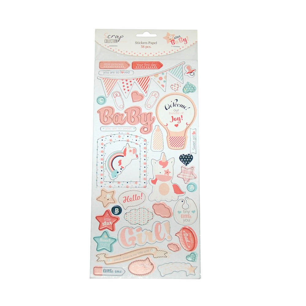 38 piezas adhesivas con motivos infantiles de bebe en color rosa, perfectas para decorar trabajos de scrapbooking, invitaciones de bautizo, álbumes de fotos, cuadros de bebe y todo tipo de trabajos manuales.