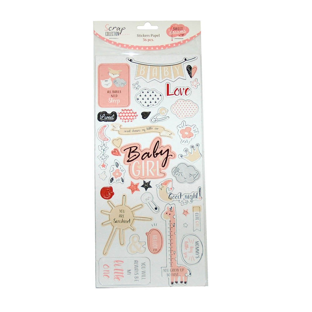 37 piezas adhesivas con motivos infantiles de bebe en color rosa, perfectas para decorar trabajos de scrapbooking, invitaciones de bautizo, álbumes de fotos, cuadros de bebe y todo tipo de trabajos manuales.