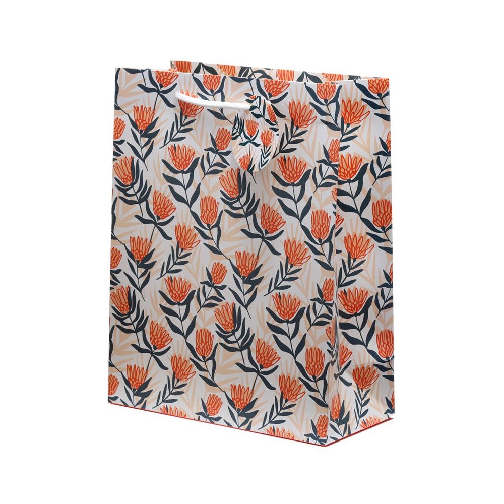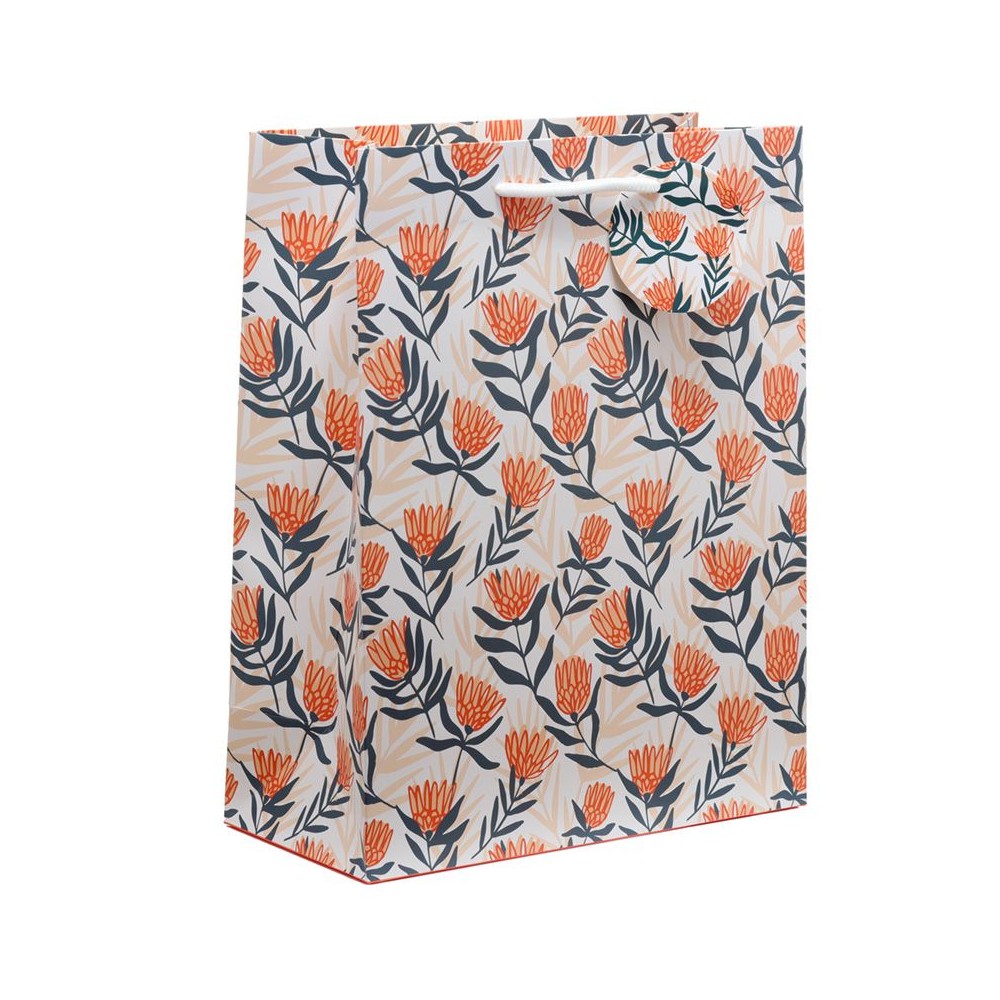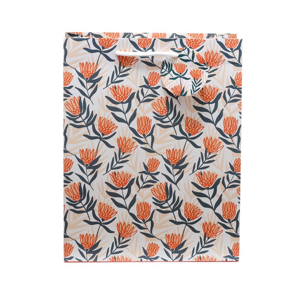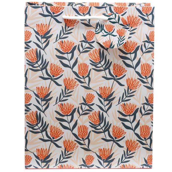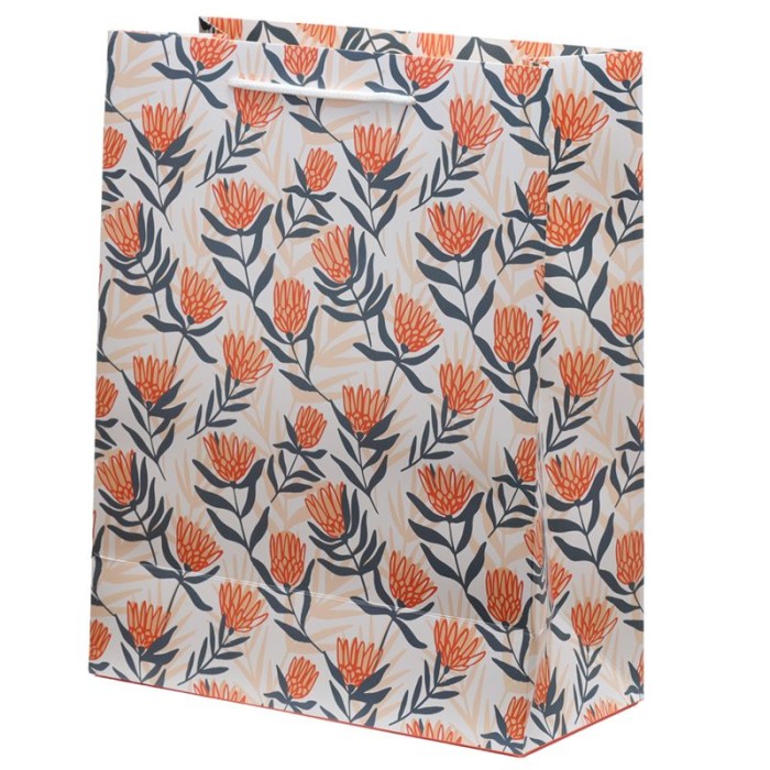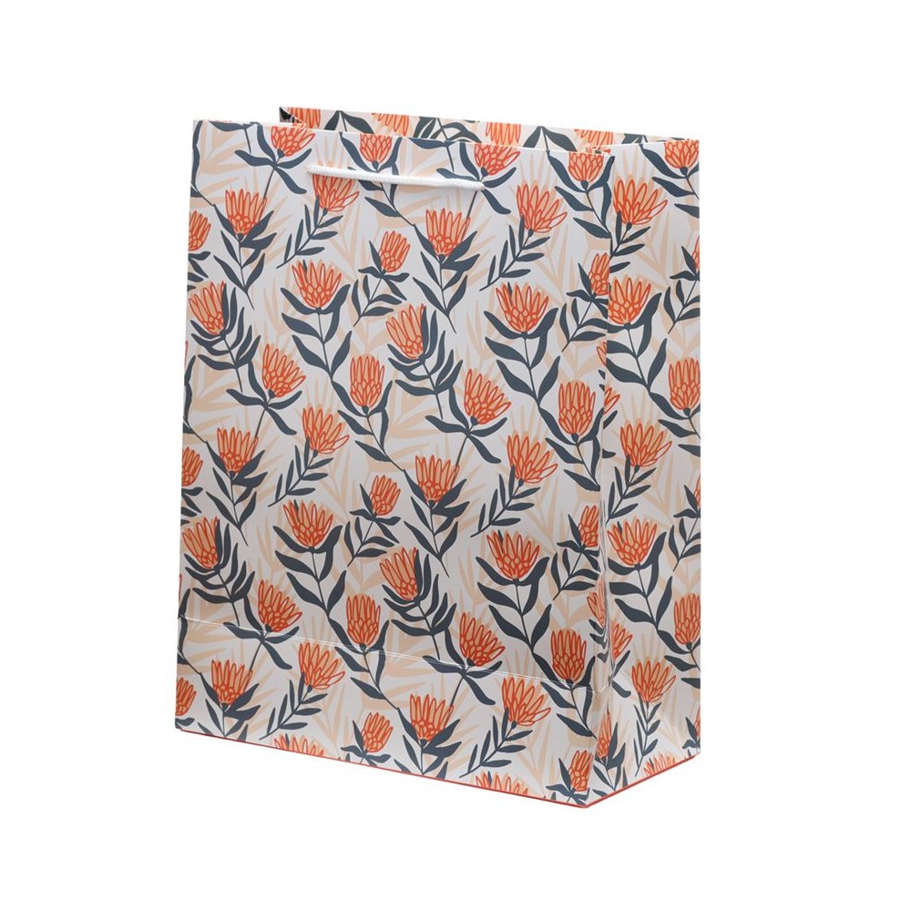 Bolsa de Regalo grande fabricada en papel resistente de alto gramaje con asas de nylon, diseño floral en tonos naranjas y azules sobre fondo claro. Igual por las ambas caras.