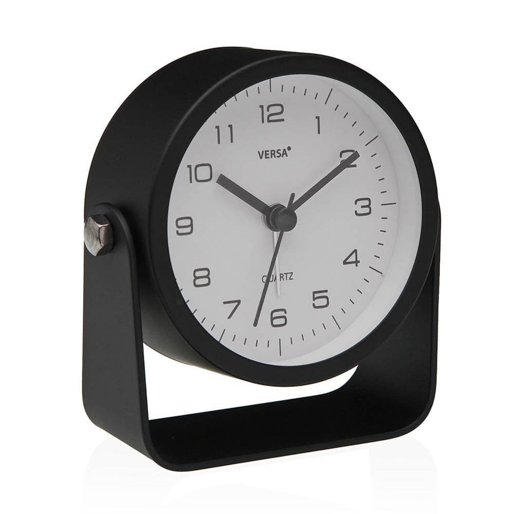 Reloj de mesa con despertador en color negro mate, diseño redondo, números naturales y manecillas negras con movimiento silencioso. Tamaño: 10x4.1x10 cm.