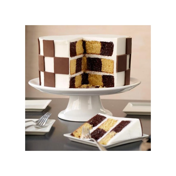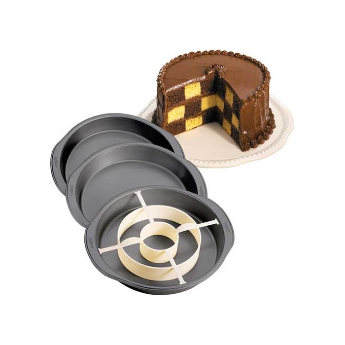 Con este set de moldes para tartas de Wilton podrás realizar de una forma super sencilla bizcochos multicolor con efecto de tablero de ajedrez. Los tres moldes tienen 22,5 cm de diámetro y 3,8 cm de profundidad.
