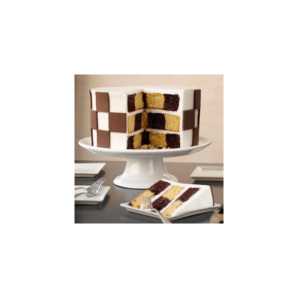 Con este set de moldes para hornear de Wilton podrás realizar de una forma super sencilla bizcochos multicolor con efecto de tablero de ajedrez. Gracias al anillo separador, puedes dividir fácilmente la masa y crear tu bizcocho de colores sin que las masas se unan. Los tres moldes tienen 22,5 cm de diámetro y 3,8 cm de profundidad. Puedes elaborar 3 capas para tu tarta con las bandejas.