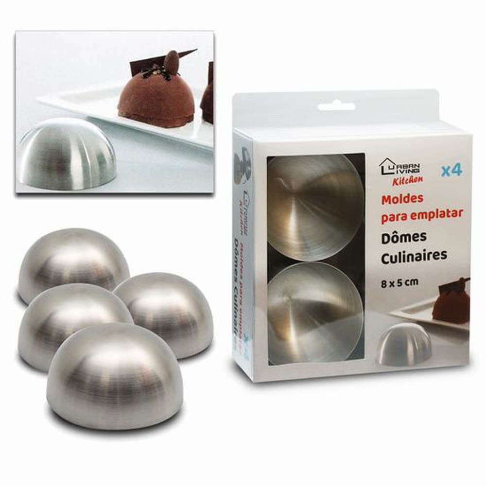 Set de 4 moldes con forma de semiesfera realizados en metal, perfectos para emplatar alimentos. Los 4 moldes tienen el mismo tamaño.