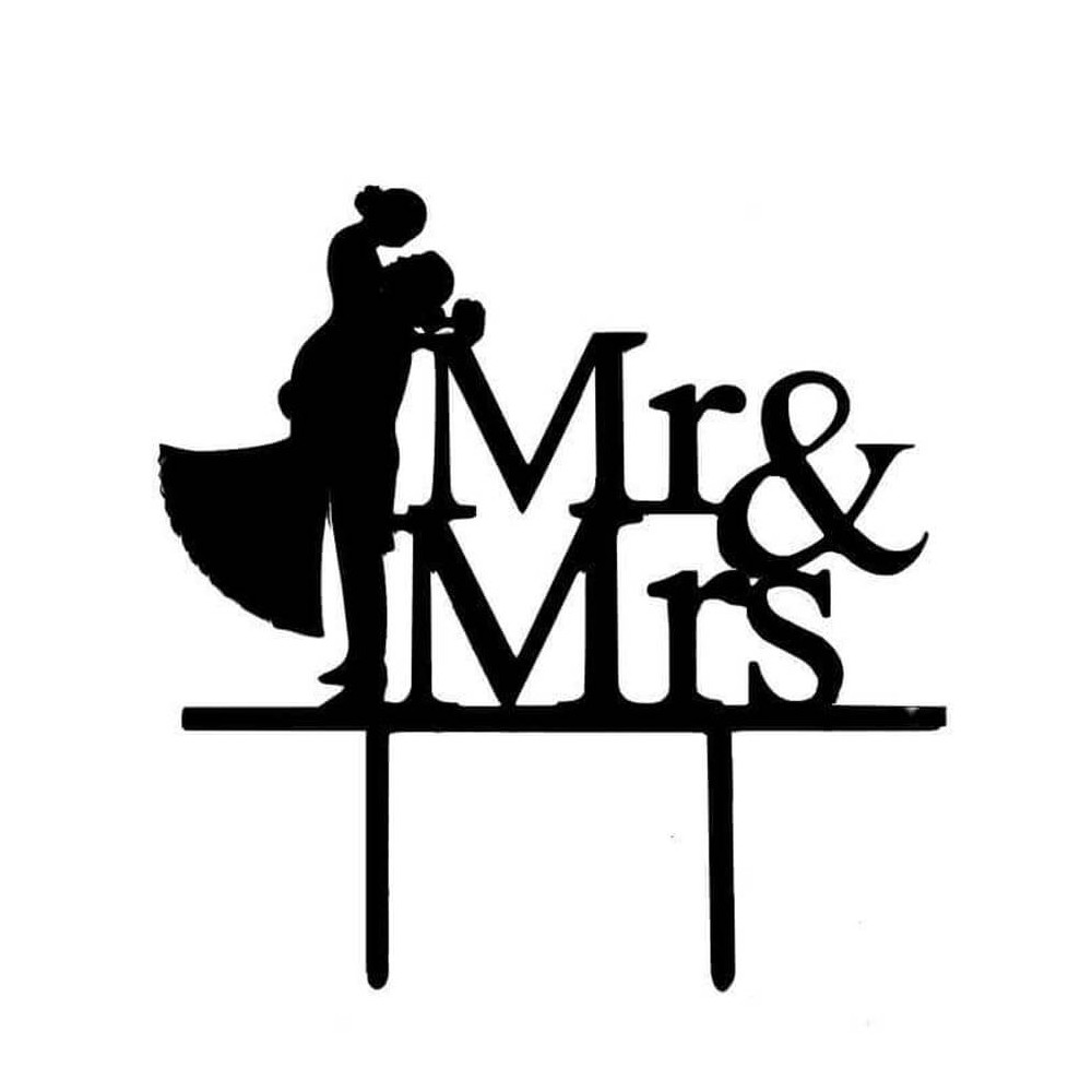 Topper para tarta o pastel modelo "MR & MRS" realizado en acrílico negro de 2mm de grosor cortado al láser, lavable y reutilizable, ideal como complemento decorativo para coronar de forma romántica y elegante tartas de boda o aniversario.