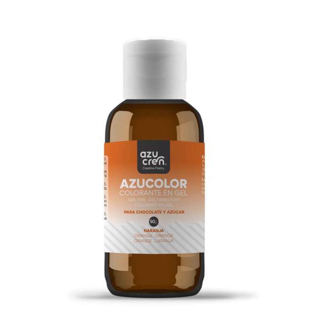 Colorante alimentario en solución líquida de color naranja, ideal para uso en pastelería y repostería para teñir azúcar y chocolate. Envasado en botella de plástico.