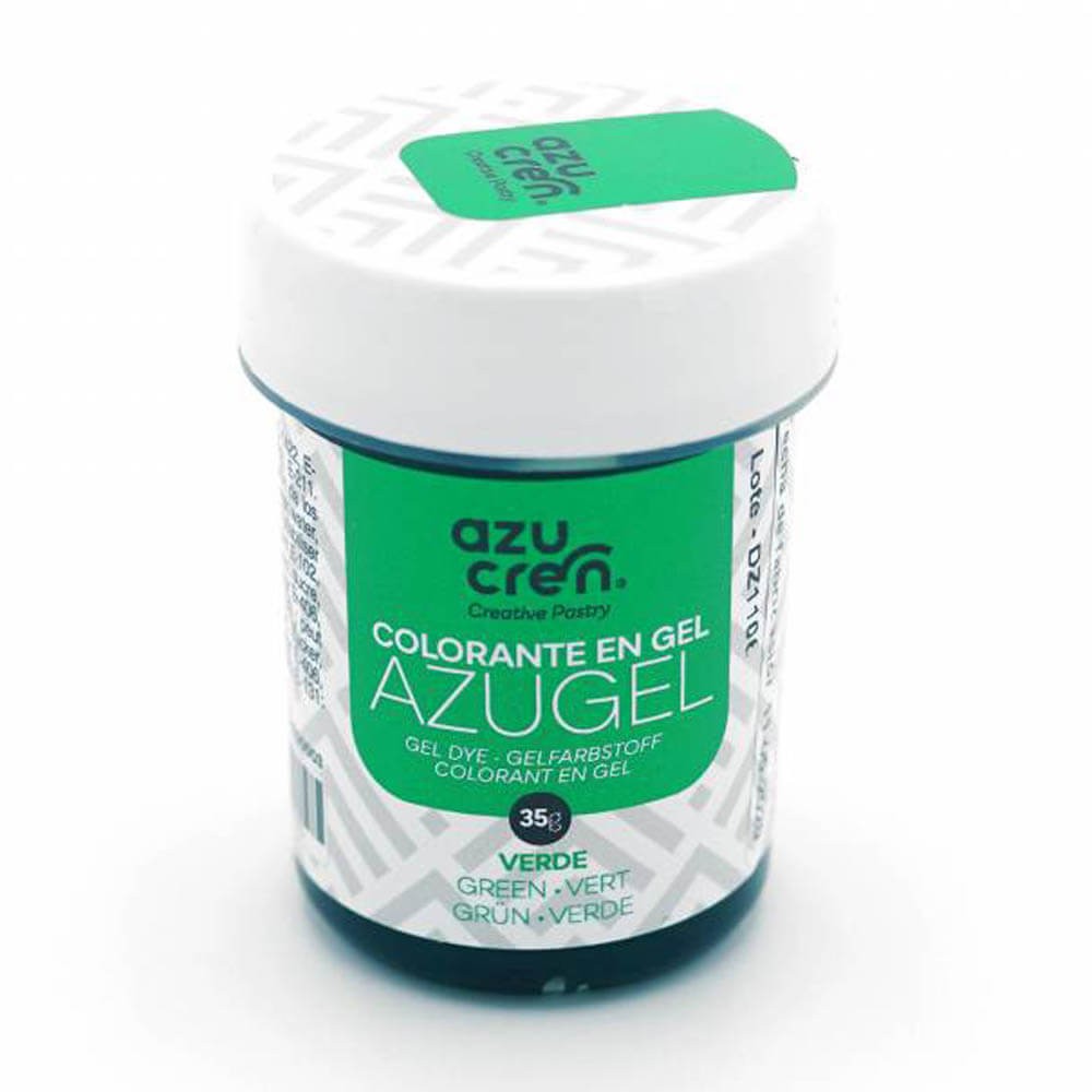Colorante alimenticio con textura en gel de la gama Azugel de Azucren en color verde, ideado especialmente para teñir y colorear fondant, buttercream, masas, etc.