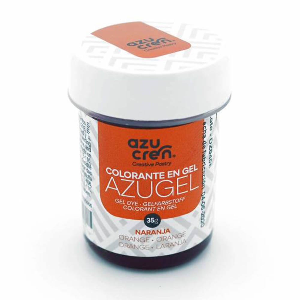 Colorante alimenticio con textura en gel de la gama Azugel de Azucren en color naranja, ideado especialmente para teñir y colorear fondant, buttercream, masas, etc.
