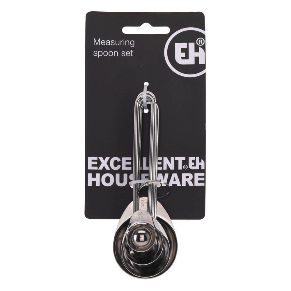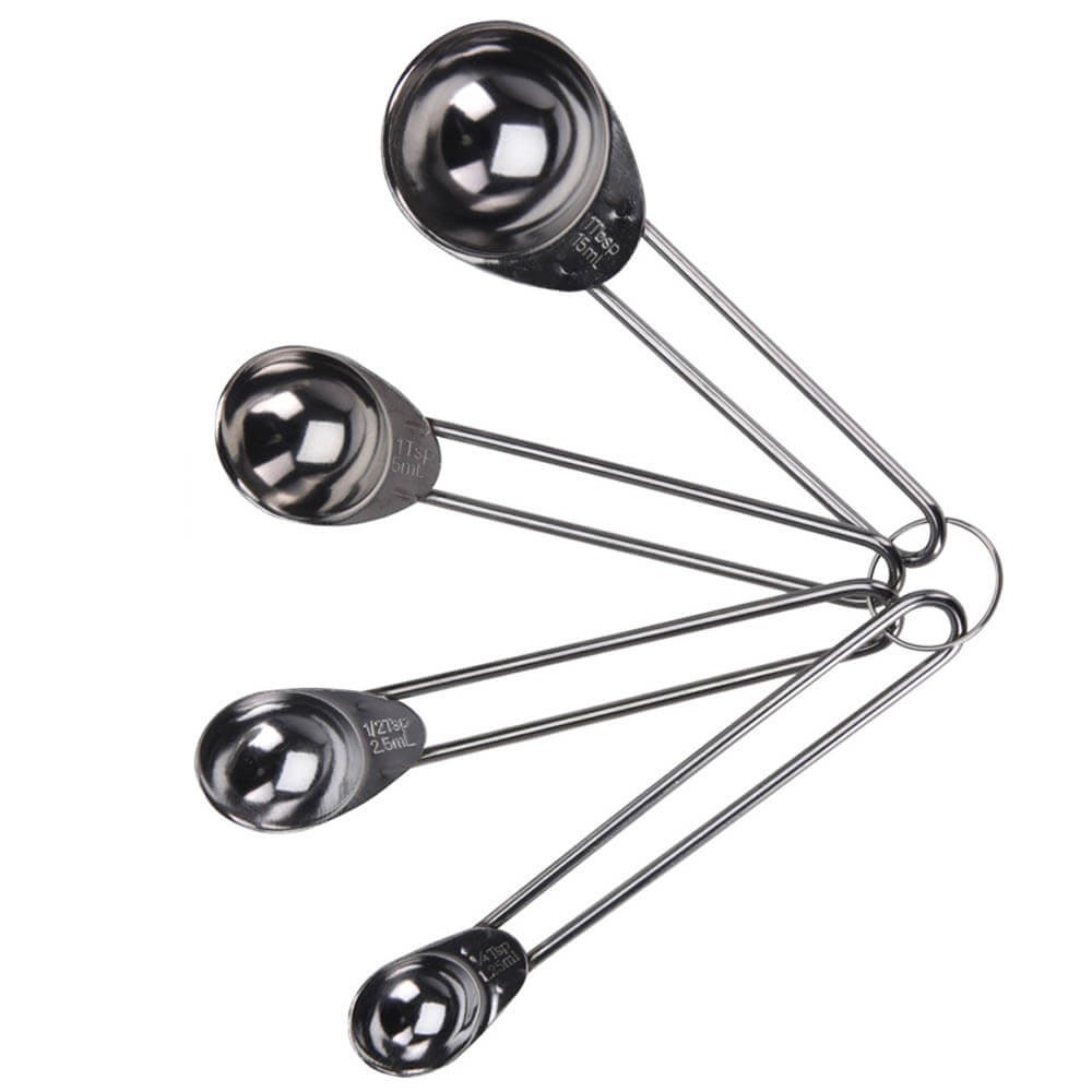 Conjunto de 4 cucharas medidoras fabricadas en acero inoxidable, una herramienta esencial para preparar con exactitud recetas que precisen la medición de cantidades pequeñas, especialmente en repostería.