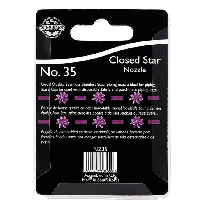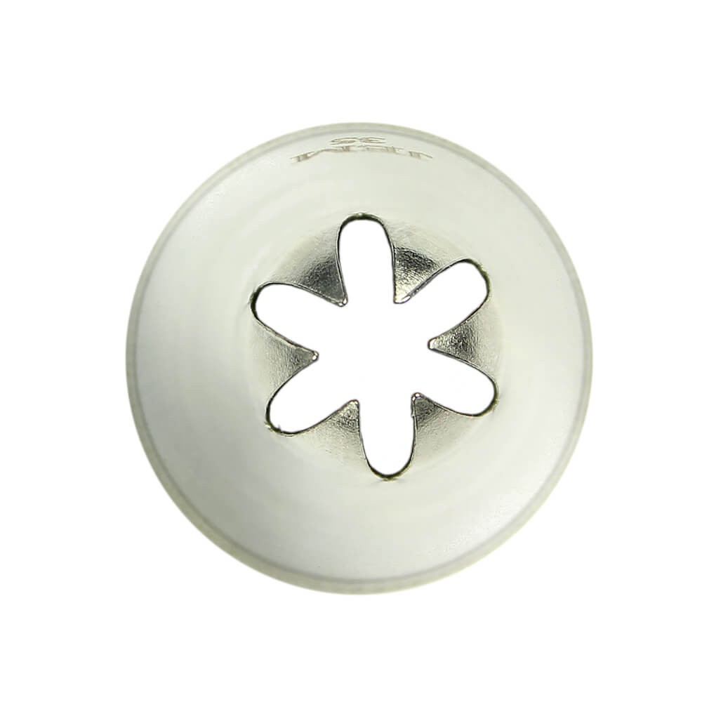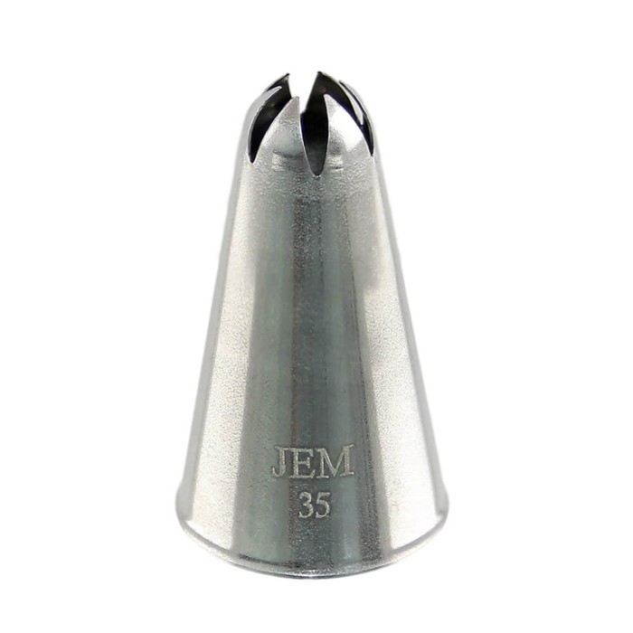 Boquilla #35 de la marca Jem realizada en acero inoxidable de una sola pieza sin puntos de soldadura, diseño estrella cerrada con 6 puntos, perfecta para realizar técnicas de flores colgantes, conchas, rosetas y estrellas acanaladas.