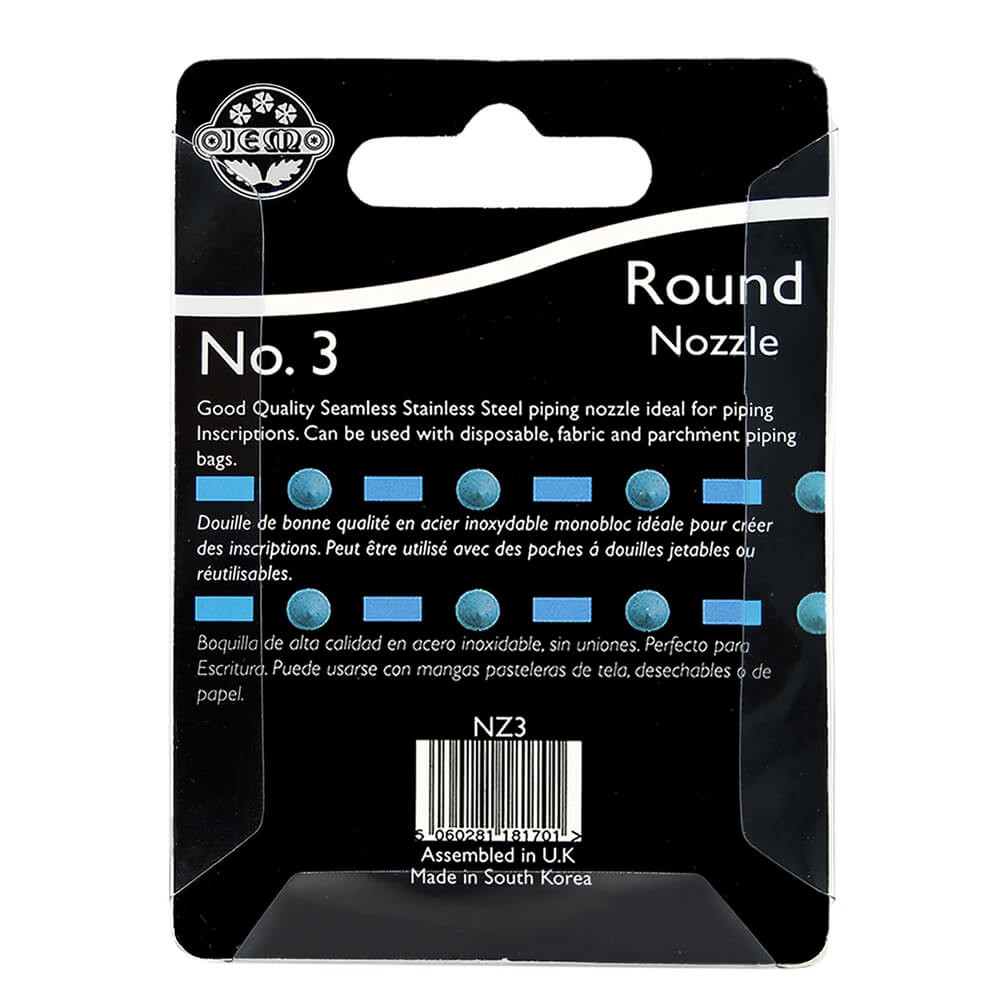 Boquilla #3 de la marca Jem realizada en acero inoxidable de una sola pieza sin puntos de soldadura, diseño redondo, perfecto para crear contornos, letras, puntos, bolas, abalorios, cordeles, celosías y encajes.