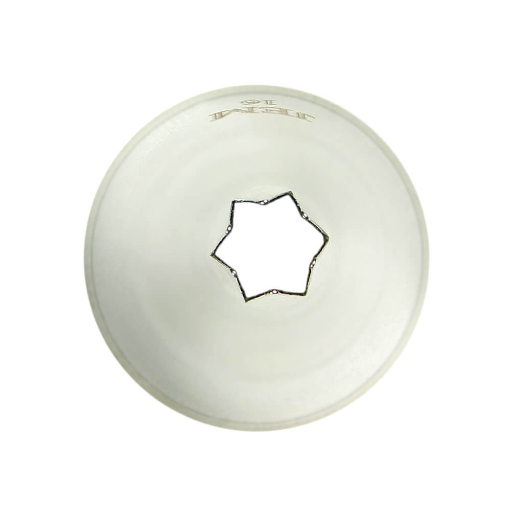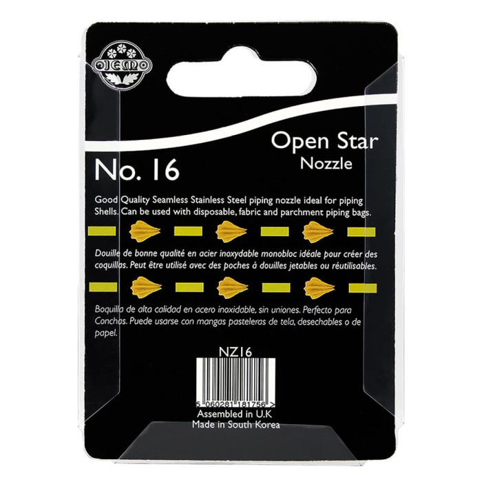 Boquilla #16 de la marca Jem realizada en acero inoxidable de una sola pieza sin puntos de soldadura, diseño estrella abierta con 6 puntos en la cabeza, perfecta para realizar técnicas de estrella, flores caídas, conchas, rosetones y decoraciones con muchas nervaduras.