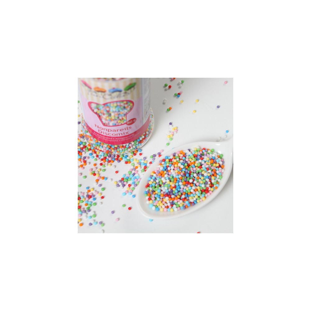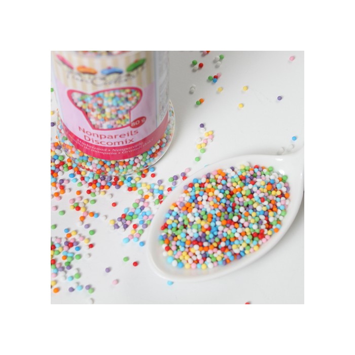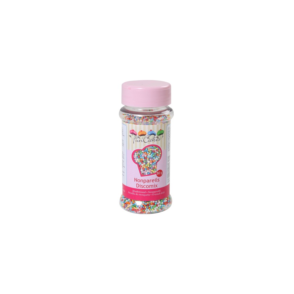 Añade diversión y color a tus postres con las decoraciones de azúcar Nonpareils Discomix de FunCakes. Este bote contiene mini perlitas comestibles de colores vibrantes en un práctico dispensador, perfectas para decorar de forma rápida y sencilla cupcakes, cookies, tartas y helados,