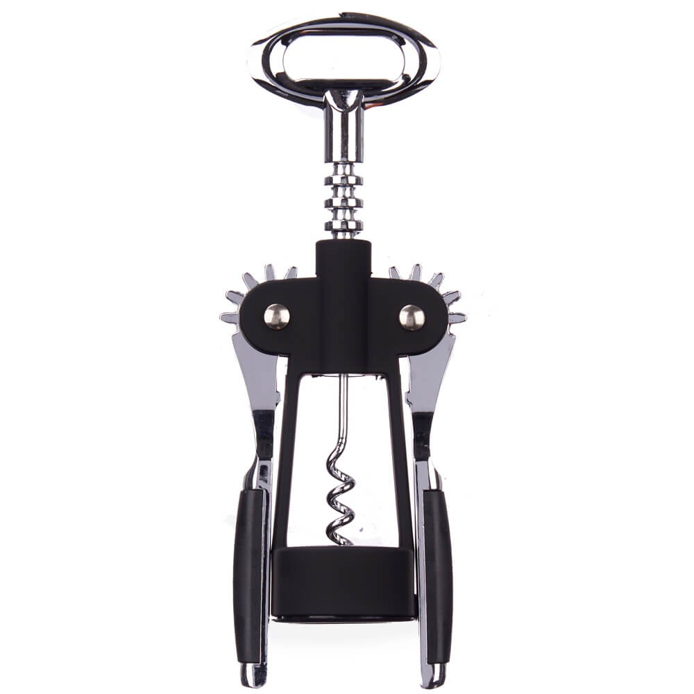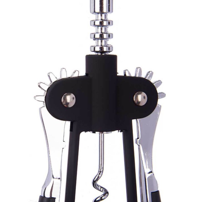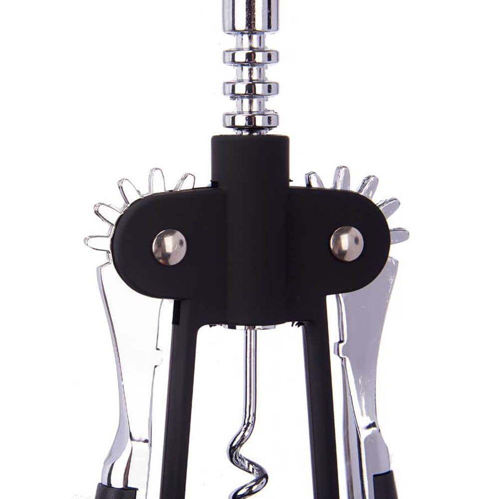Sacacorchos doble palanca en metal cromado y negro, mecanismo sencillo para abrir botellas con facilidad. Duradero y elegante.