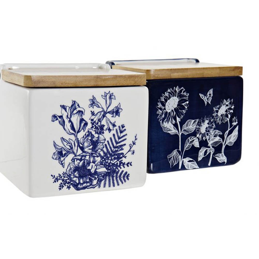 Salero de cocina fabricado en cerámica con tapa de bambú, diseño floral en color blanco o azul.