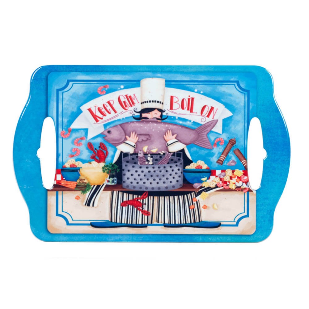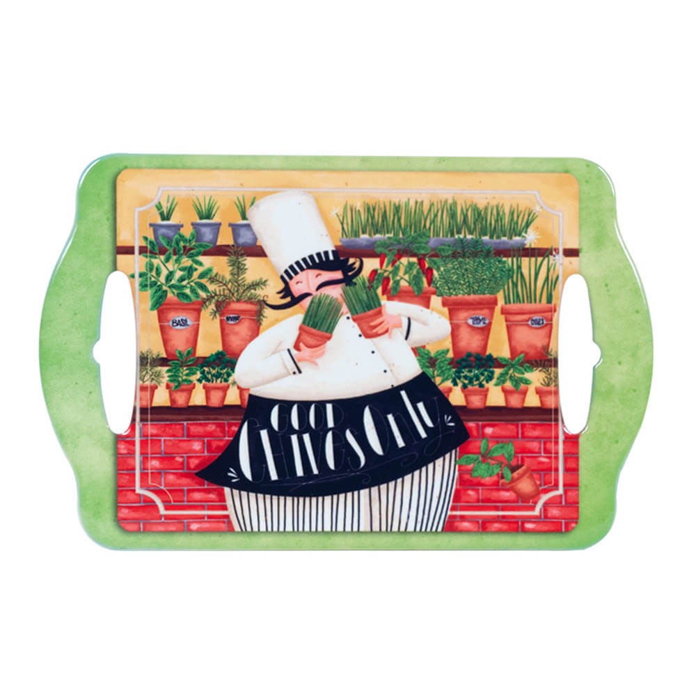 Una tabla con asas decorada con simpáticos dibujos de chefs en la que podrás apoyar menaje caliente protegiendo el mantel y la mesa de posibles quemaduras o emplearla como bandeja para realizar una tabla de quesos o para cortar embutidos en la mesa.