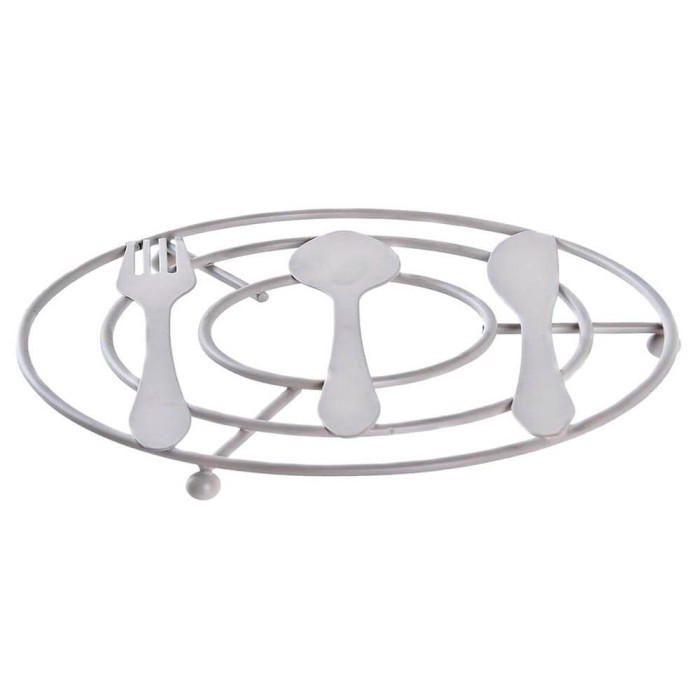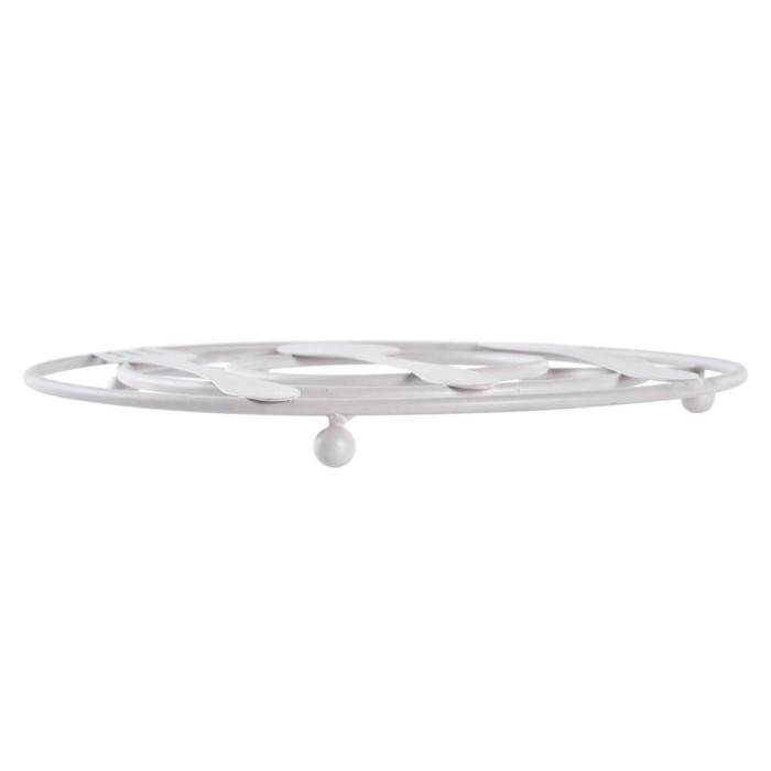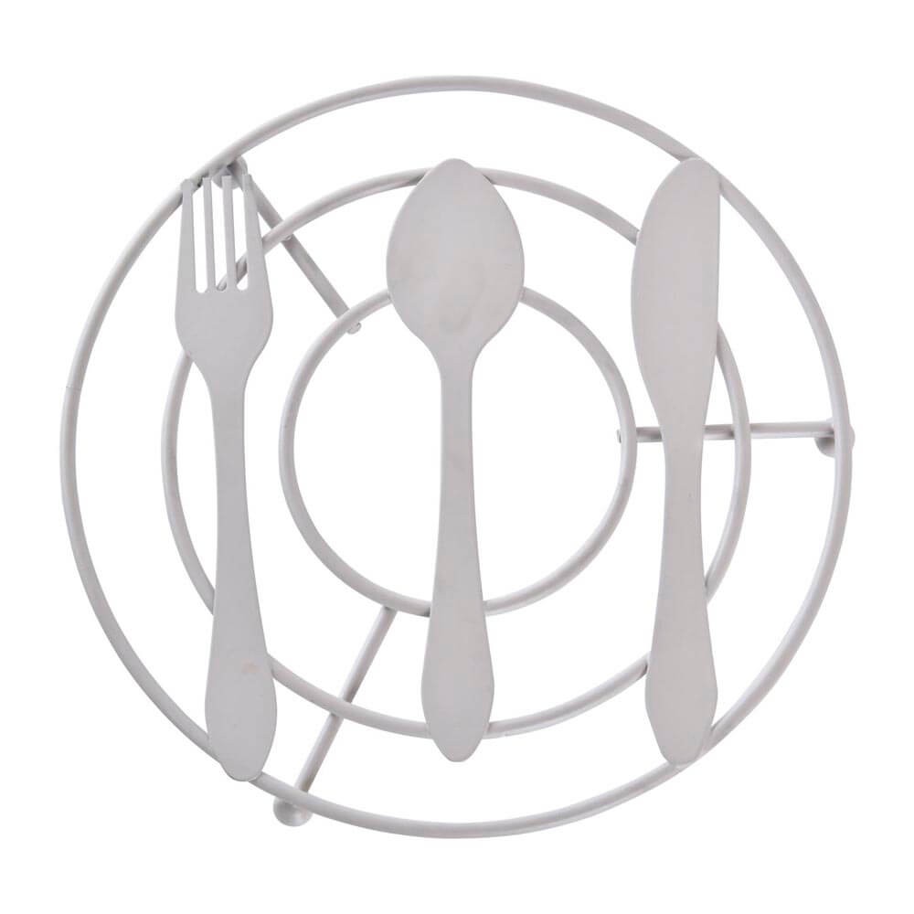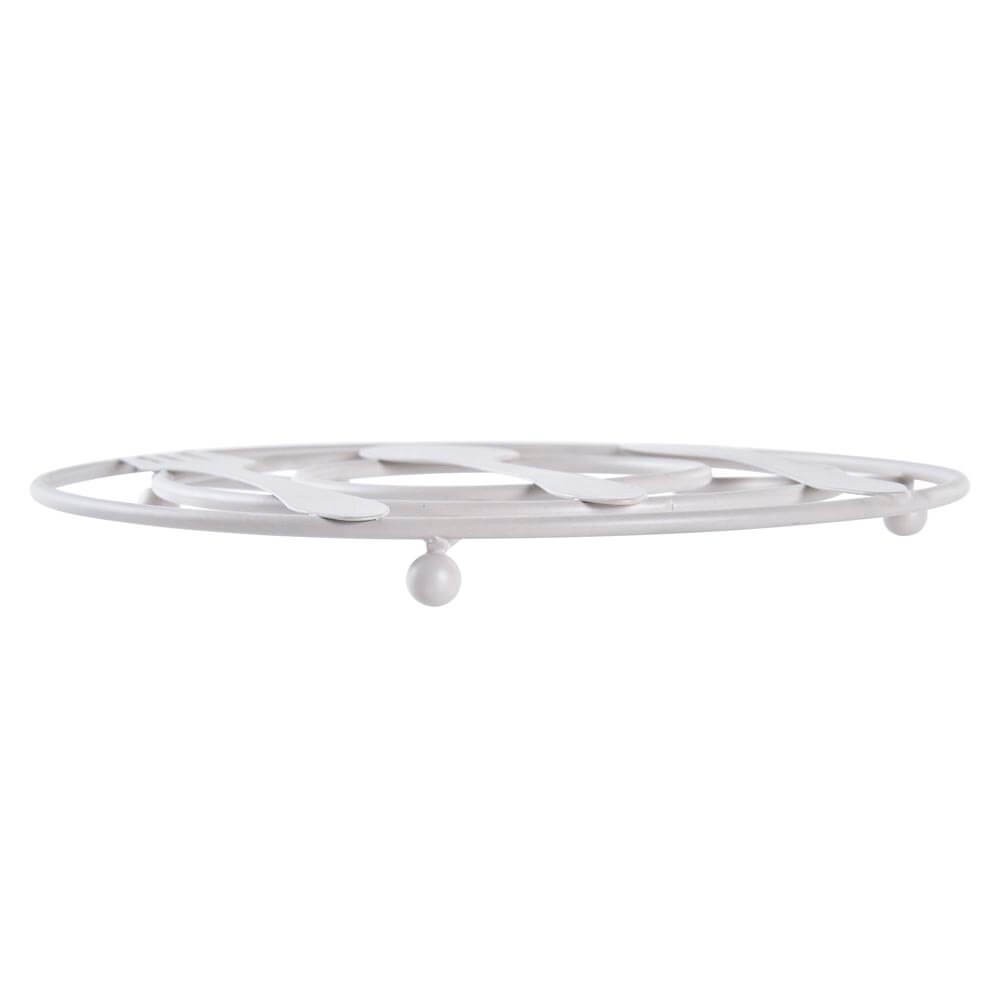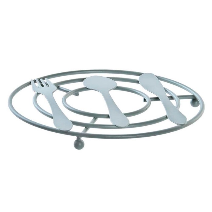 El savamantel redondo esta fabricado en metal de color crema o verde menta acabado mate con un diseño tradicional de cubiertos, lleva tres patas en forma de bola para mantener el calor alejado de la superficie.