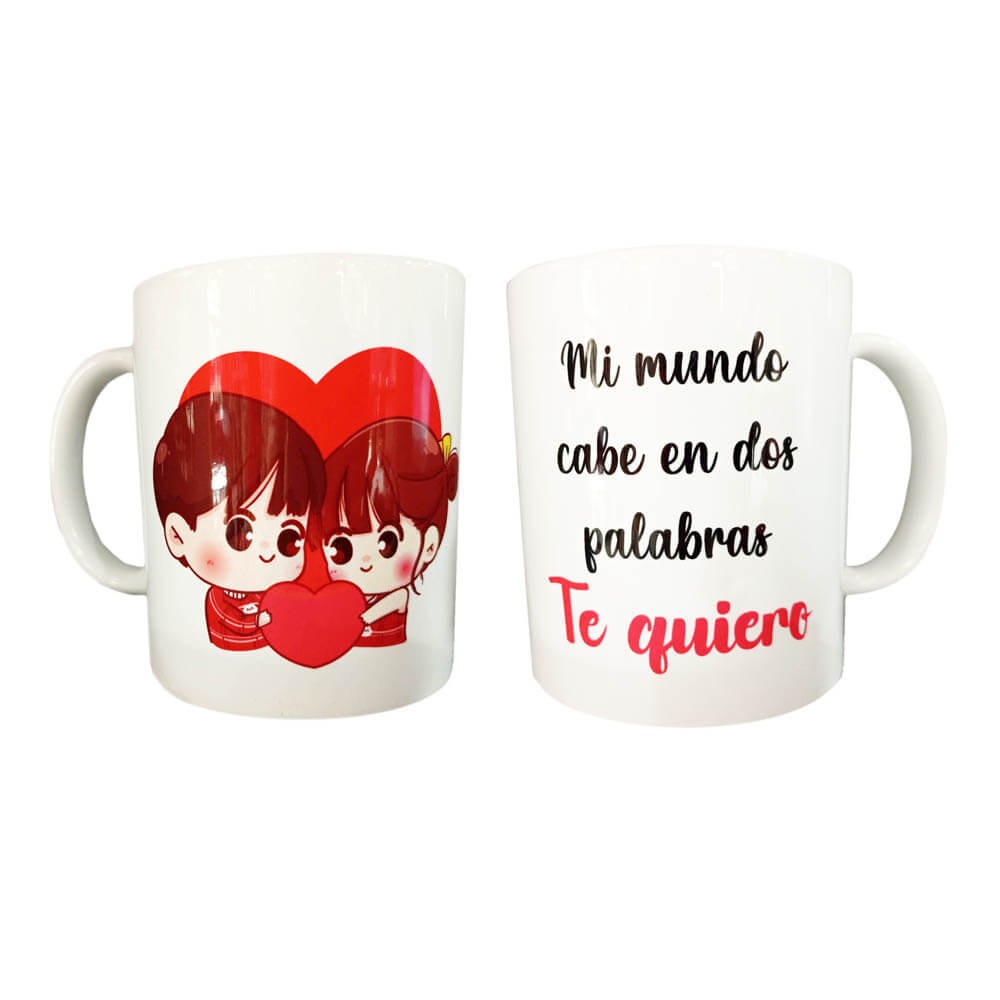 Imagina despertar cada mañana y disfrutar de tu bebida favorita en una taza que representa el amor puro y sincero. Nuestra taza de cerámica blanca presenta la ilustración de una pareja de enamorados sosteniendo un corazón, acompañada de la frase "Mi mundo cabe en dos palabras: Te quiero". Este diseño dulce y romántico captura la esencia misma de su relación, recordándoles constantemente lo importante que son el uno para el otro.
