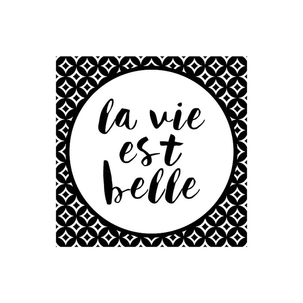 Sello de goma "La vida es bella" montado sobre bloque de madera, ideal para decorar proyectos de scrapbooking. Con este sello podrás ilustrar tarjetas, etiquetas, libretas, paquetes, álbumes de recorte, etc. El sello representa un cuadrado decorado y en su interior un círculo con una inscripción "La vie est belle".