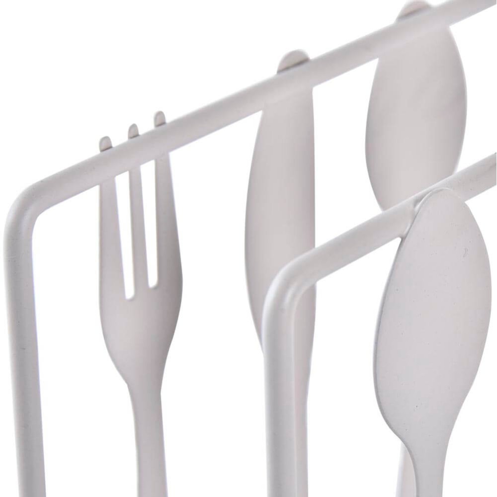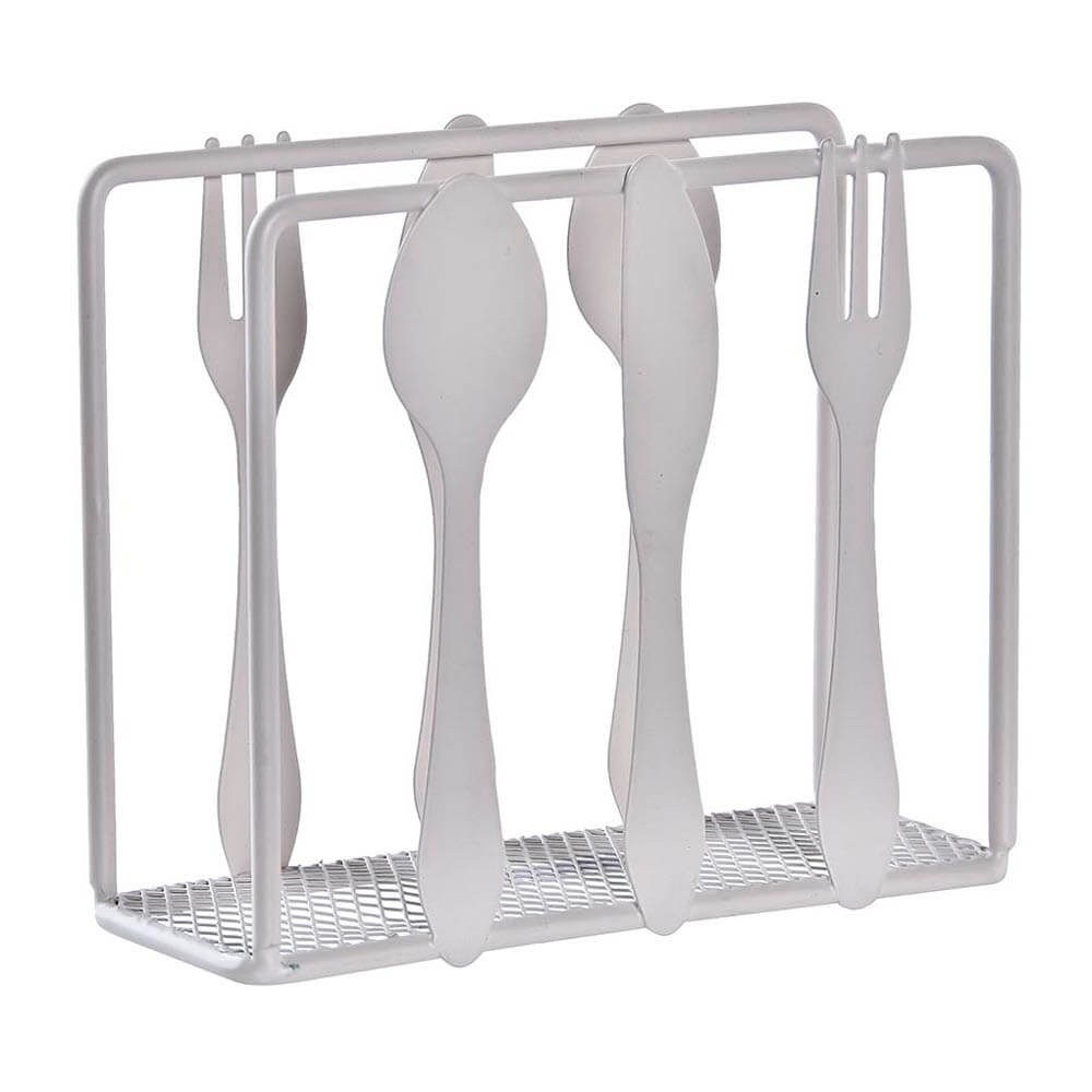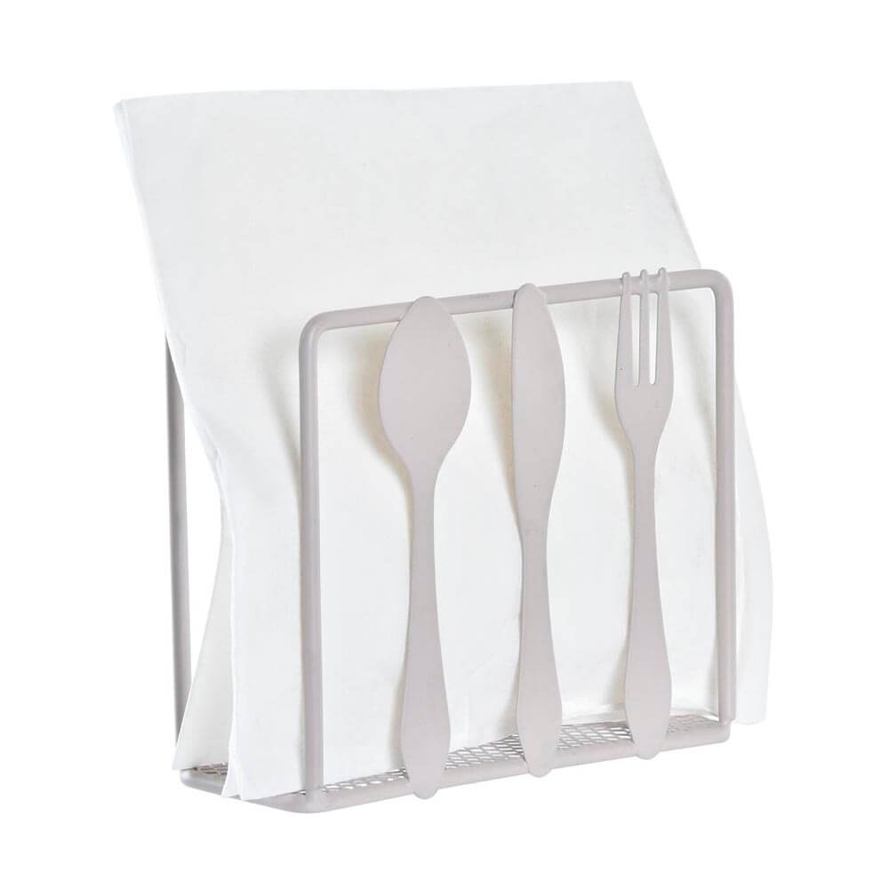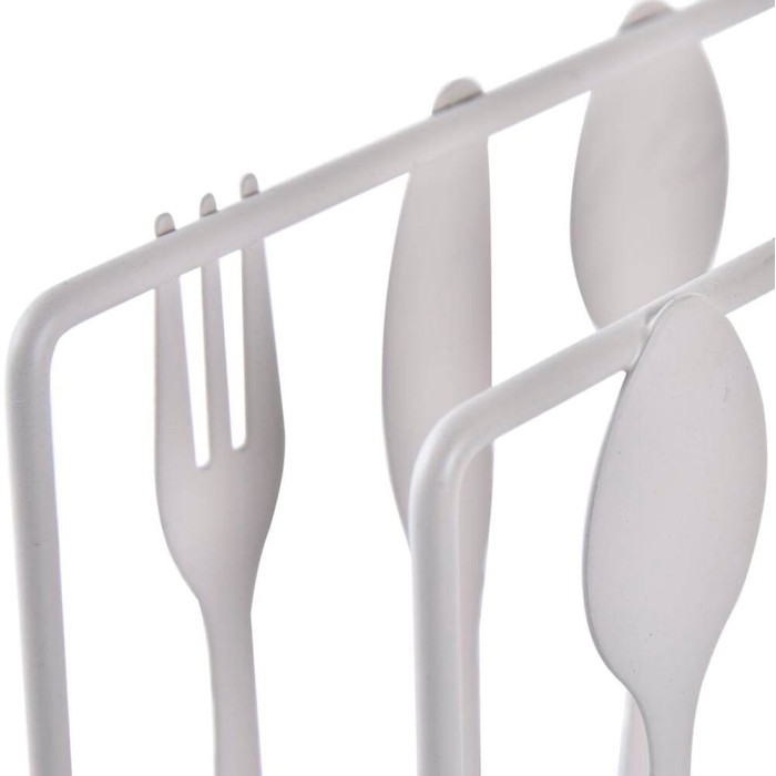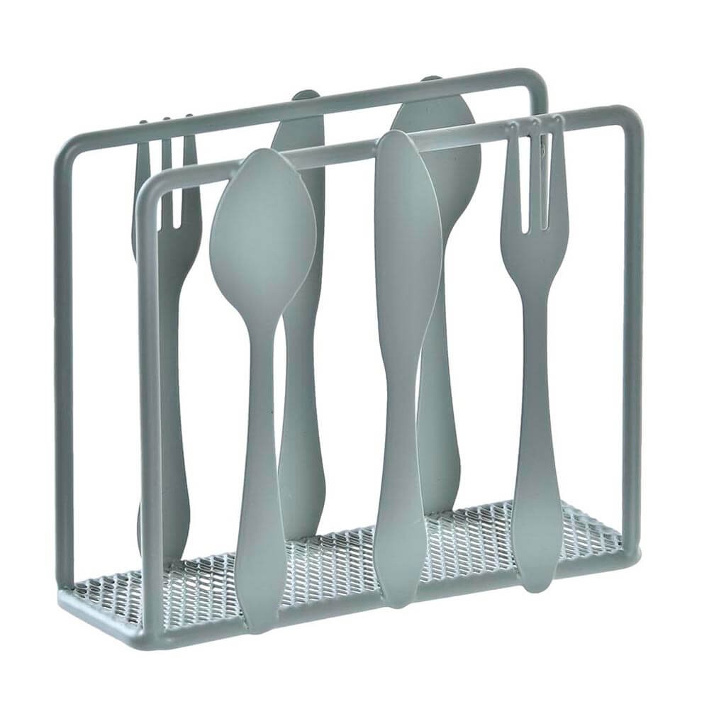 Con un diseño de estilo vintage ideal para mesas y cocinas tradicionales o rústicas, el servilletero esta realizado en metal de color crema o verde menta acabado mate con base de rejilla y laterales formados por la silueta de los cubiertos de cocina, tenedor, cuchillo y cuchara.