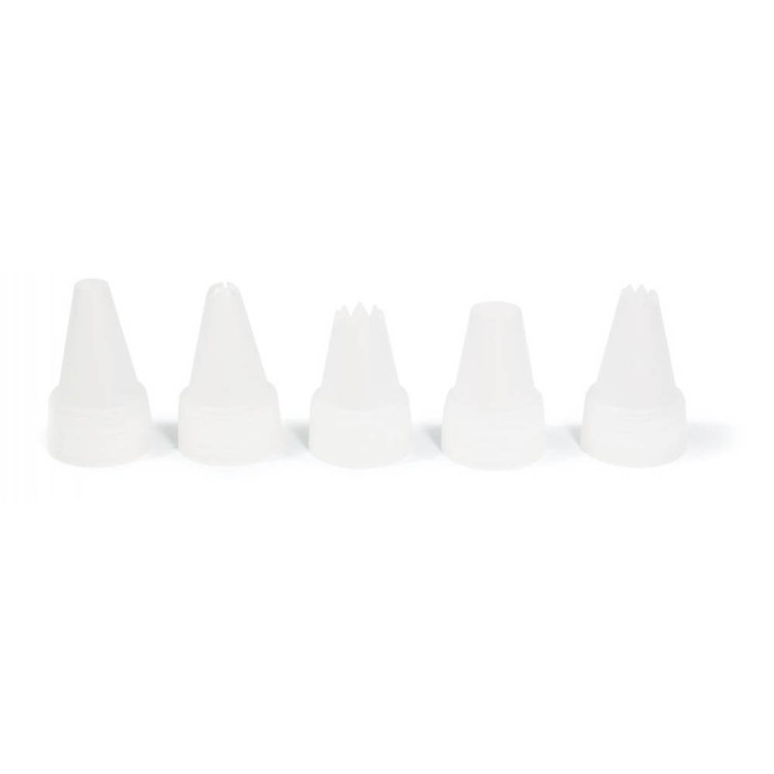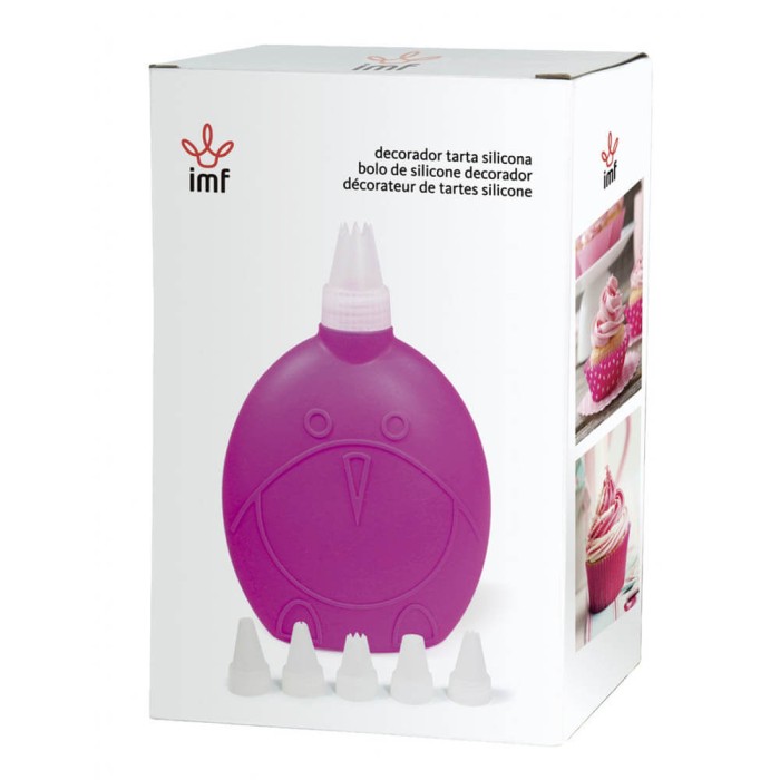 Utensilio de silicona para decorar tartas y pasteles con 6 boquillas intercambiables, puede emplearse como sustituto de la manga pastelera. El dosificador es resistente al calor hasta 250ºC, se rellena fácilmente quitando la tapa transparente que tiene en el cuerpo. Para cambiar de boquilla tan solo hay que desenroscarla y enroscar una nueva del set.