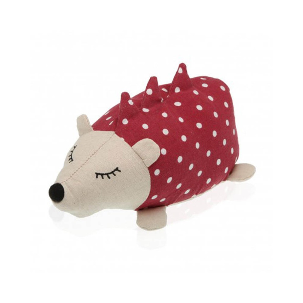 Sujeta puertas diseño erizo confeccionado tejido de poliéster rojo con lunares, lleva patas y cara en color crudo con los ojos bordados en hilo negro. Un accesorio ideado para sujetar las puertas y evitar que se cierren de golpe con las corrientes de aire.