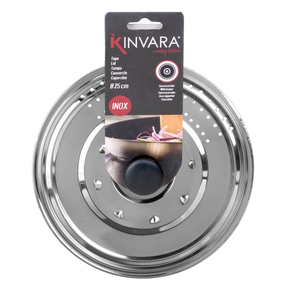 Tapa multiusos realizada en acero inoxidable con orificios de salida, perfecta para usar con sartenes, cazos y ollas. Función escurridor y anti salpicaduras. Resistente y apta para lavavajillas. 25cm.