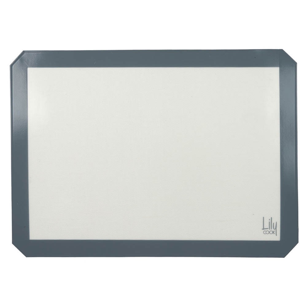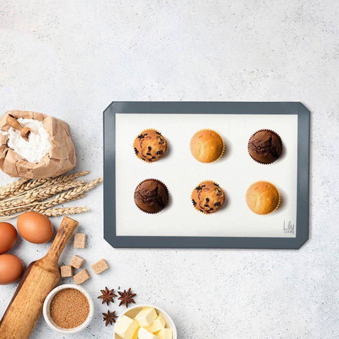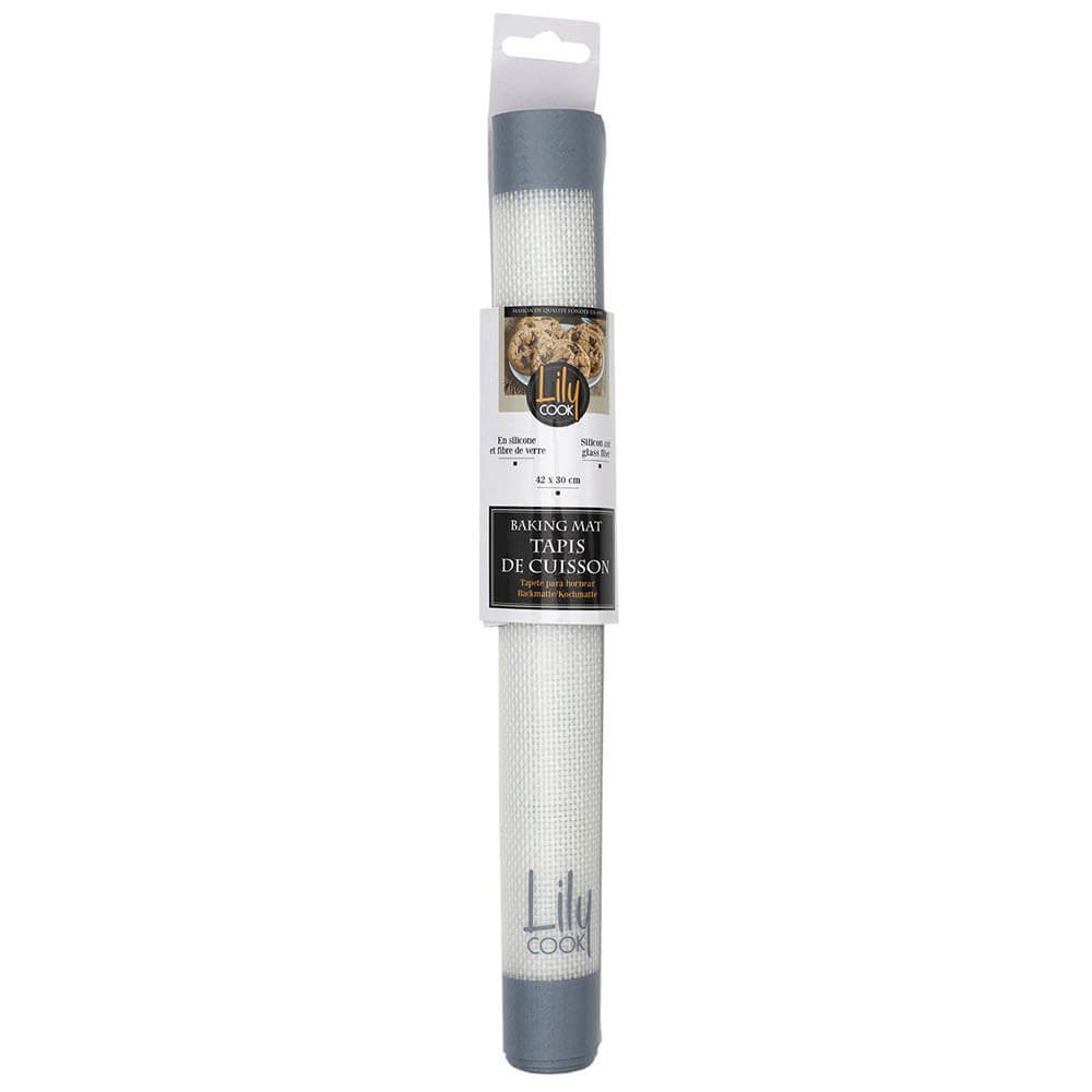 Tapete de silicona con fibra de vidrio que proporciona un calor uniforme, apto para entrar en contacto con alimentos. El tapete se puede emplear para hornear dulces y masas pero también como superficie de trabajo para extender y trabajar las masas.