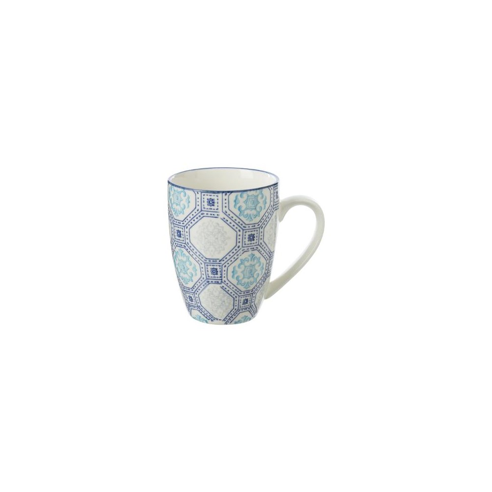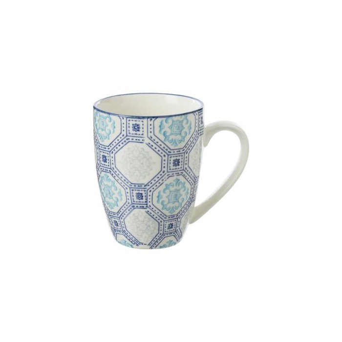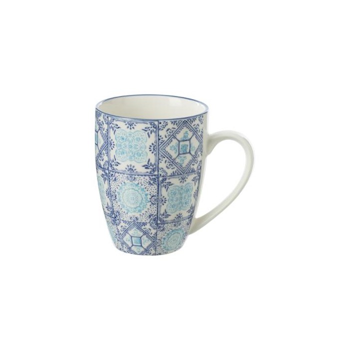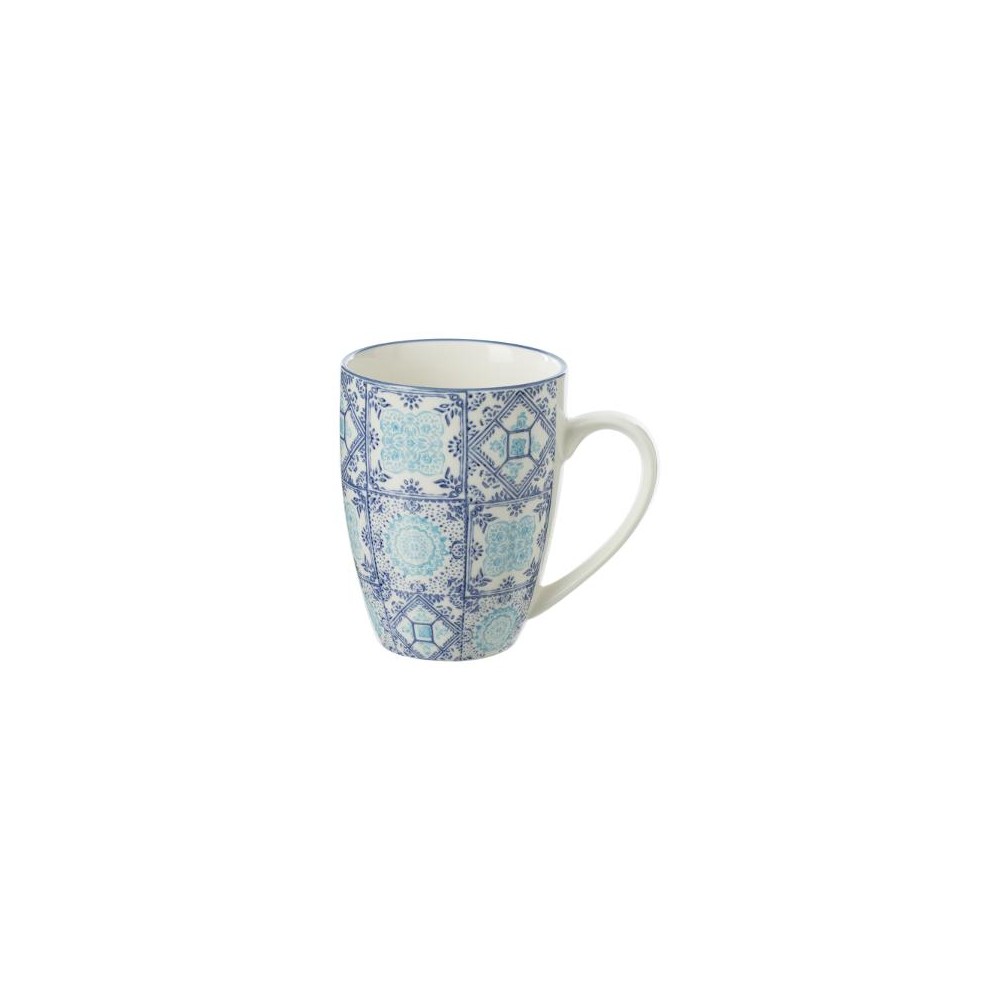 Taza para desayuno de 34CL realizada en loza de barro decorada con dibujos de estilo clásico en tonos azules que recuerdan a los azulejos clásicos, 4 modelos. La taza con asa es perfecta para disfrutar del desayuno todas las mañanas, ideal como taza de café, su diseño aportara un toque de color a la mesa.