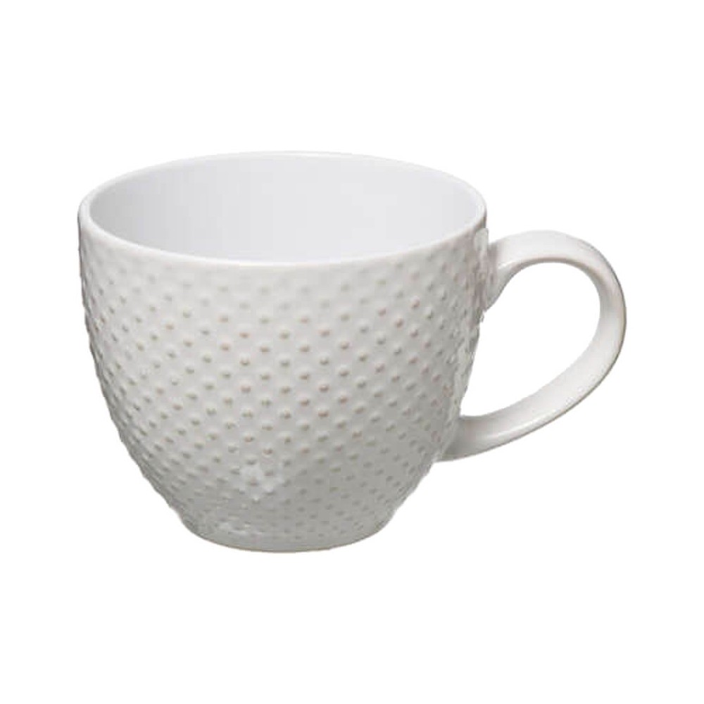Esta taza funcional y decorativa tiene un atractivo diseño de estilo rústico con líneas verticales o puntos en relieve, perfecta como taza desayuno para disfrutar todas las mañanas de una buena taza de café o de té .