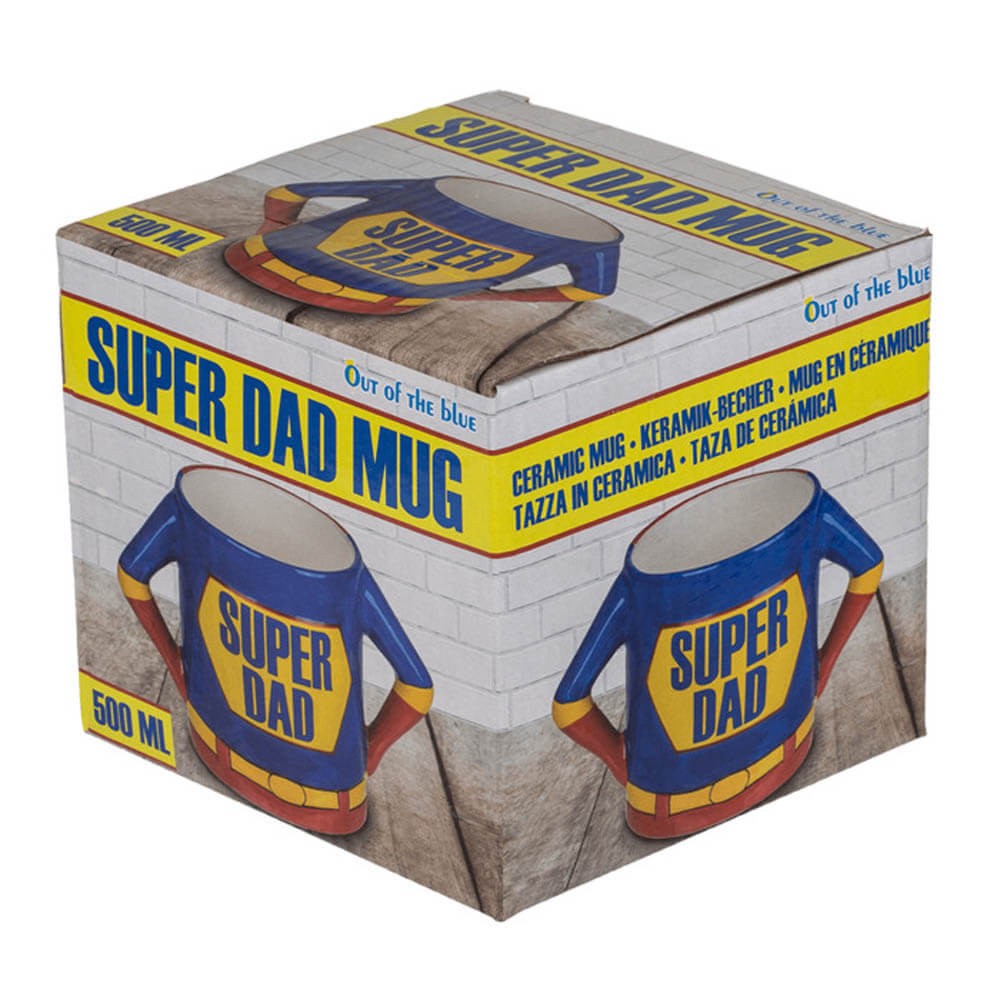 Taza original realizada en cerámica con un divertido diseño de SUPER DAD con las asas en forma de brazos en jarra y traje de superhéroe en color rojo y azul, perfecta para regalar a tu padre.