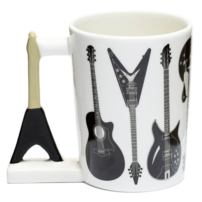 Taza original con asa 3D en forma de guitarra, perfecta para que disfrutes cada mañana de tu bebida favorita o como idea de regalo original para amantes de los instrumentos musicales.