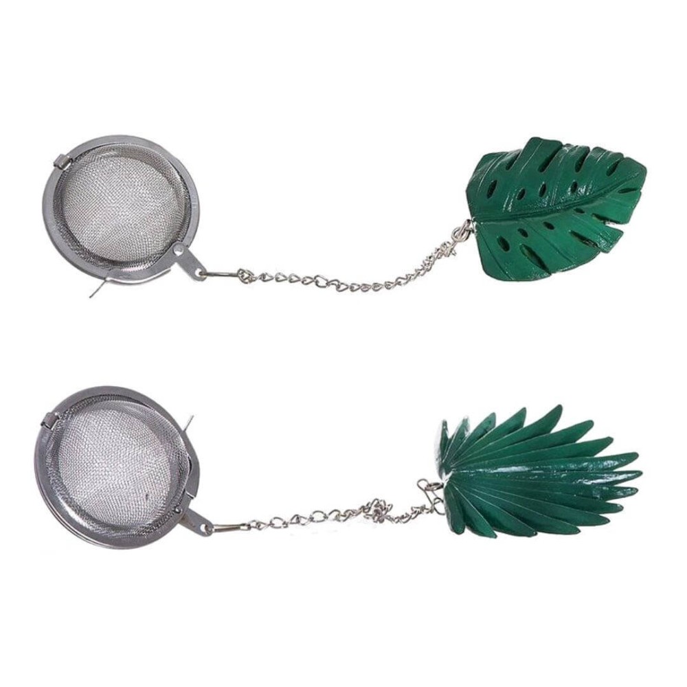 filtro de té en acero inoxidable decorado con una hoja tropical de resina. 2 modelos.